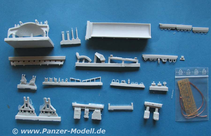 Im Umbausatz finden wir über 70 Resinteile, verdrilltes Kupferkabel und eine Platine PE Teile.