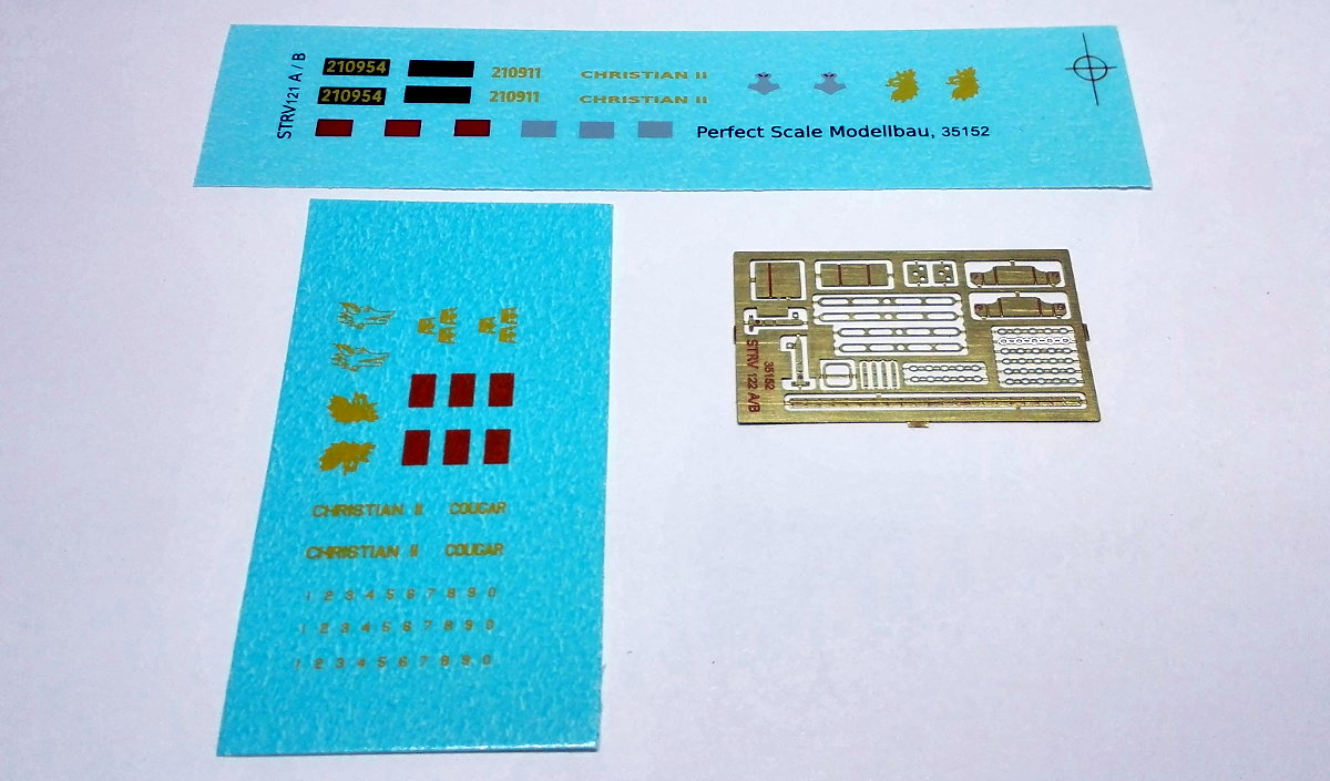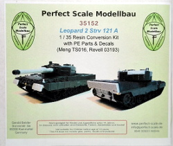 Perfect Scale Modellbau bietet mit der Art. Nr. 35152 einen Umbausatz für den Leopard 2A4 an. Mit diesem Set kann die schwedische Variante, der Strv. 121 A, dargestellt werden. Als Basisbausatz werden vom Hersteller der Leopard 2A4 von Meng mit der Art. Nr. TS016 oder das Modell von Revell mit der Art. Nr. 03193 empfohlen. In der kleinen Verpackung finden sich alle erforderlichen Teile um eben diese schwedische Version darzustellen. Neben der nötigen Bauteilen aus Resin die zusätzlich sehr feine Photoätzteile und zwei kleine Decalsheets enthalten. Die Fertigungsqualität der Bauteile wirkt sehr gut. Saubere und scharfkantige Details, keine Lufteinschlüsse und relativ kleine Angüsse. Die Bauanleitung besteht aus einem doppelseitig farbig bedruckten DIN A4 Blatt in dem die einzelnen Baustufen an einem Modell gezeigt werden. Leicht verständlich und übersichtlich aufgeführt sehe ich in Verbindung mit der Bauanleitung für das jeweilige Basismodell keine Probleme. Die Resinteile dürften auch für Einsteiger kein Problem darstellen. Bei den sehr filigranen PE-Teilen habe ich aber meine Zweifel ob sie einen Anfänger nicht doch überfordern würden. Daher möchte ich dieses Set dem erfahrenen Modellbauer empfehlen. Insgesamt gesehen ist das ein schönes Set um auch mal ein Modell außerhalb des Mainstream zu bauen. Ganz besonders begeistert bin ich davon dass auch die erforderlichen Decals für die schwedische Variante beiliegen. Viele Hersteller bieten Umbausätze an, jedoch fehlen in fast allen Fällen die nötigen Decals so dass man gezuwngen ist diese bei anderen Herstellern zu suchen. Hier bekommt man aber das Rundum-sorglos-Paket. Es ist alles aus einer Hand in einem Set zu beziehen was erforderlich ist. Fantastisch!