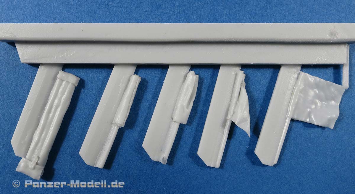 Gemeint sind die Steckflaggen mit Holzgriff, die im Viererset auf jedem Fahrzeug vorhanden waren und sind - diese sind jeweils einmal in der Flaggenfarbe blau, grün, gelb und rot und werden bei Straßenmärschen an jedes Fahrzeug der Kolonne gesteckt, beim Abschleppen aber auch an Panzerfahrzeugen auf der Schießbahn zur Darstellung der Sicherheit oder einer Störung ... kurzum für den Modellbauer ein durchaus wichtiges Details das bislang mühsam im Eigenbau hergestellt werden musste.