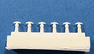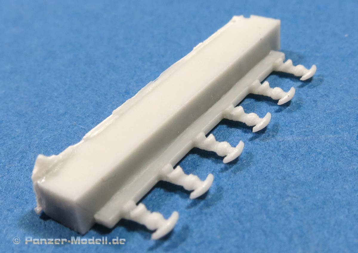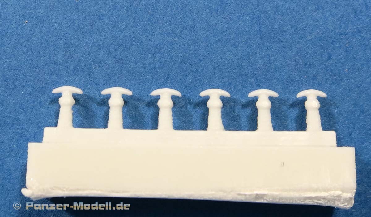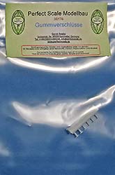 Mal wieder ein lange überfälliges Zubehörset für die Freunde moderner Fahrzeuge. Bei vielen Bausätzen fehlen diese markanten Gummiverschlüsse oder sind nur unterdurchschnittlich detailliert dargestellt. Im Plastikbeutel finden wir an einem Resinangussstück 6 dieser kleinen Gummiverschüsse in Resin. Wie von Perfect Scale gewohnt ist die Gussqualität sehr gut - gerade bei diesen Kleinteilen trennt sich im Resinguss schnell die Spreu vom Weizen - hier ist alles bestens. Knackscharf, sauber und detailliert gegossen. Die Form der Verschlüsse ist gut wiedergegeben. Die Angüsse der einzelnen Teile ist sehr klein und an der Unterseite, sodass das Abtrennen und Versäubern ein Kinderspiel ist. Der Preis liegt bei etwa 3 Euro und damit in jedes Budget passen sollten zum Aufbessern eines Modells.
