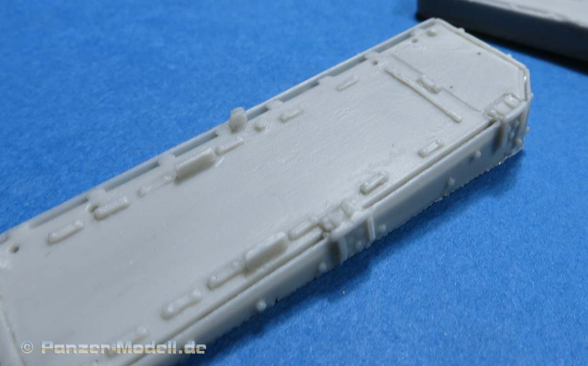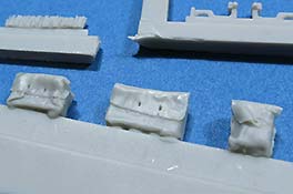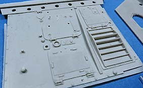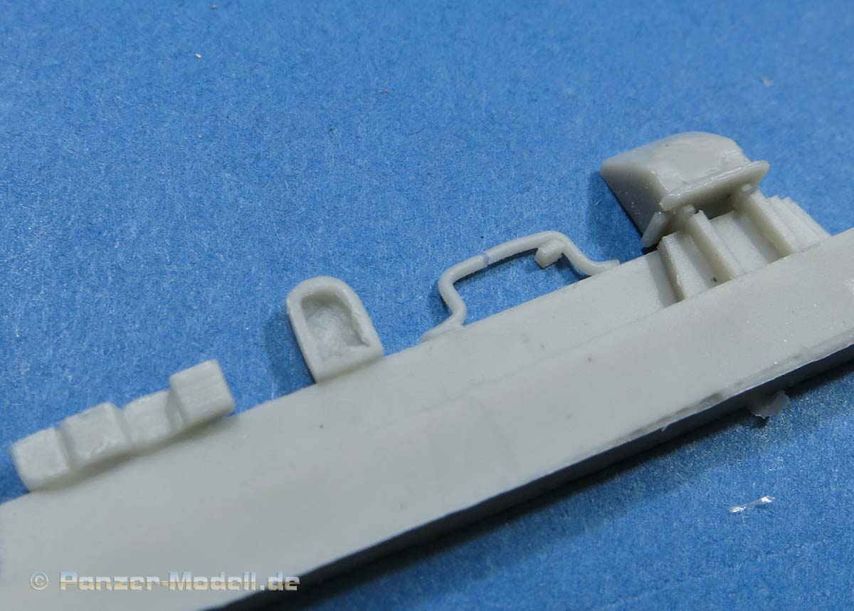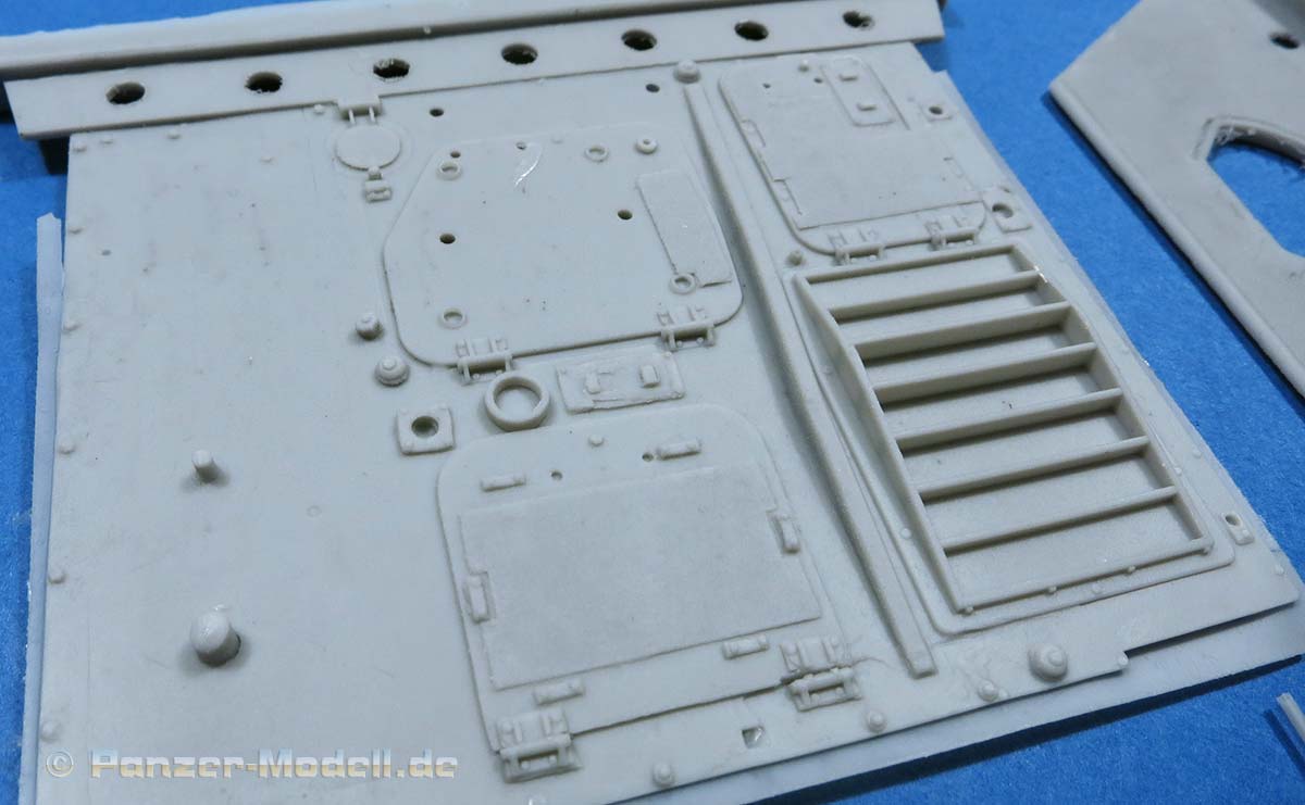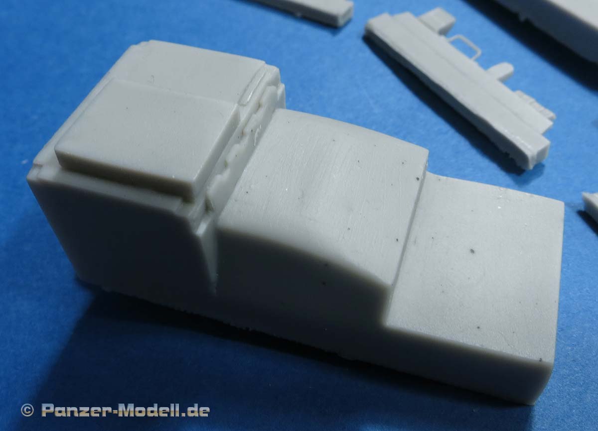 So finden sich die großen Resinteile für die Abdeckplatten des Motorraums, des Fahrers und der Bediener natürlich im Umbausatz - sauber, dünn und verszugsfrei gegossen. Auch alle entsprechenden Änderungen sind korrekt widergegeben.
