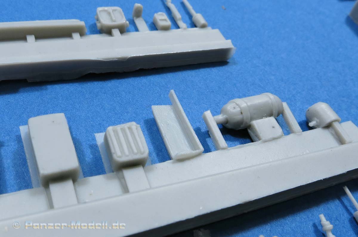 Wie von Perfect Scale gewohnt ist die Gussqualität sehr gut und die Details ausgezeichnet wiedergegeben. Die Angüsse sind ganz ok, teilweise klein, teilweise über die gesamt Langseite eines Teils - aber das sollte kein großes Problem sein, nur eben ein wenig mehr Arbeit. Produktionsbedingt sind hier und da feine Fischhäute zu erkennen, die sich aber leicht entfernen lassen. An wenigen Stellen sind einige Luftblasen zu erkennen, die aber unter etwas Spachtelmasse verschwinden werden.