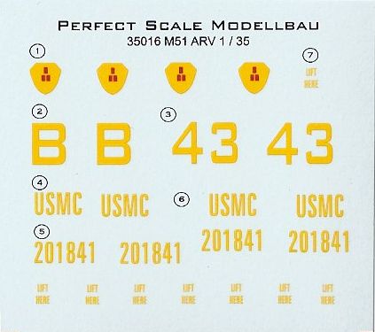 wickeln. Auch die Decals wissen zu erfreuen und sind denen von "großen Firmen" ebenbürtig. Ein Umstand, der bei Resinbausätzen nicht eben oft anzutreffen ist. Mit dem Decal-Bogen kann man ein Fahrzeug des USMC darstellen.