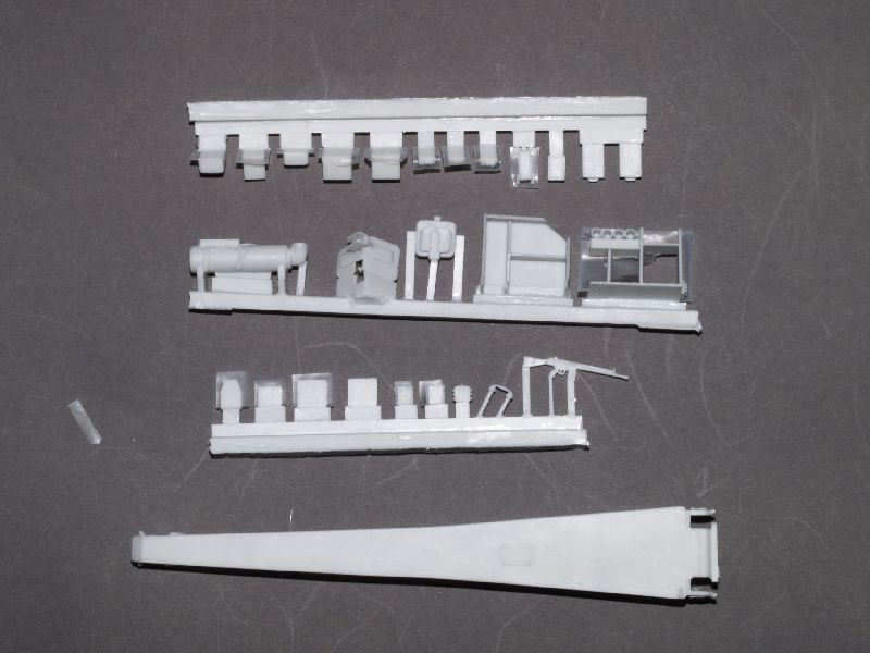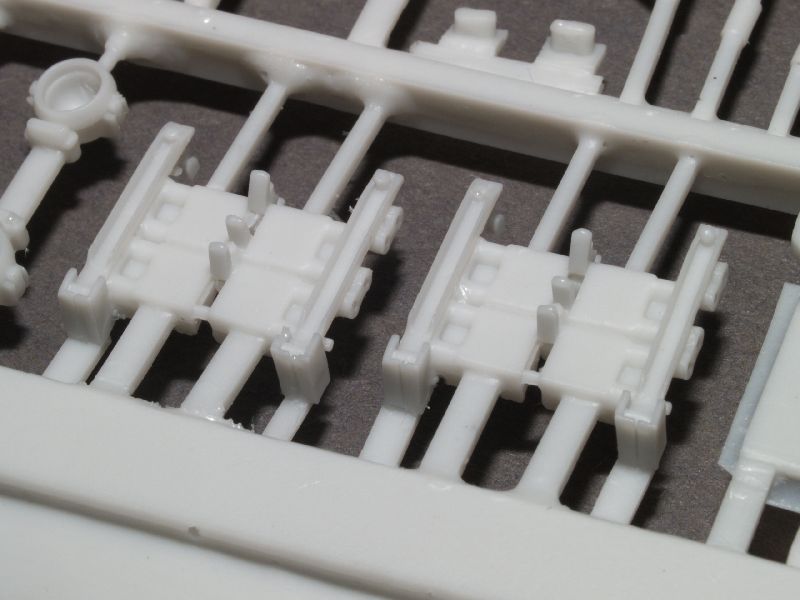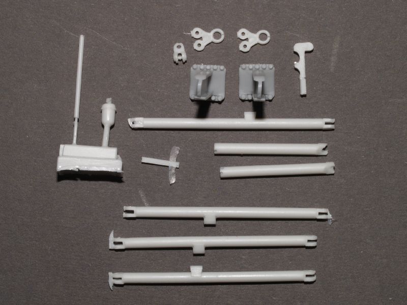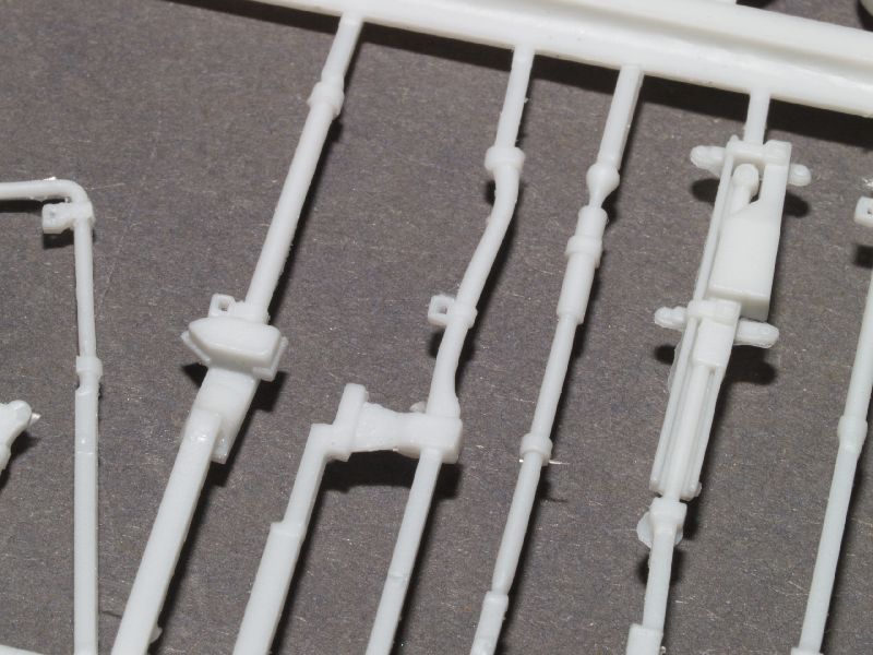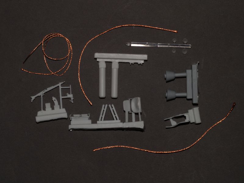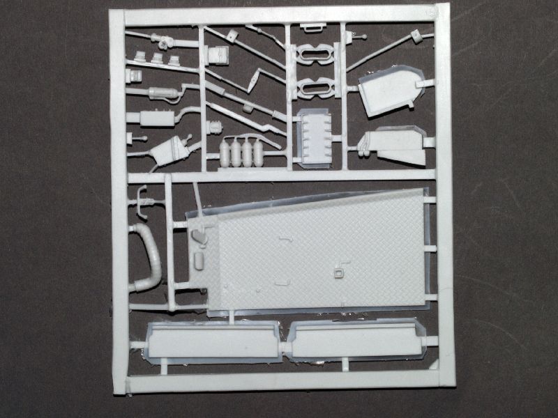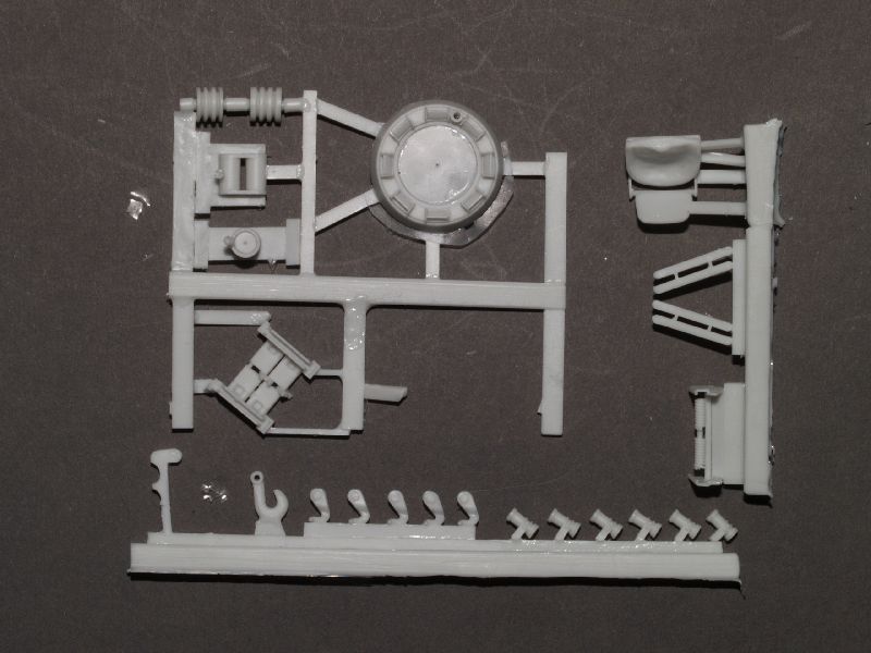 Der eigentliche Knaller sind aber die Resinteile. Verzug ist bei diesen Teilen ein Fremdwort; selbst bei so großen Teilen wie der Wanne oder dem Kranausleger. Ebenso sind Lufteinschlüsse nur sehr selten zu finden. Bei den Angüssen wurde versucht, diese auf ein Minimum zu reduzieren, so daß man die Teile mit geringem Aufwand verbauen kann. An einigen Stellen findet sich eine dünne Fischhaut, welche sich aber sehr leicht mit einem scharfen Skalpell entfernen lassen. An einigen Teilen muss man aus Draht selber Teile fertigen. Das läßt sich aber rech einfach bewerkstelligen. Die Detailierung der einzelnen Teile ist gigantisch. Allein die Oberwanne ist der Hammer. Aber auch beim Werkzeug ist die Detailierung erste Sahne. Dies sind nur zwei Beispiele.