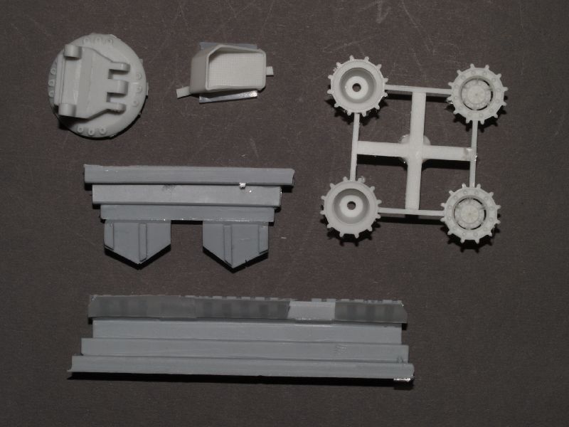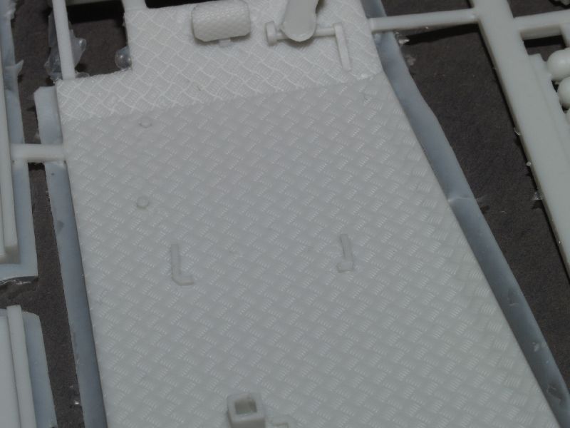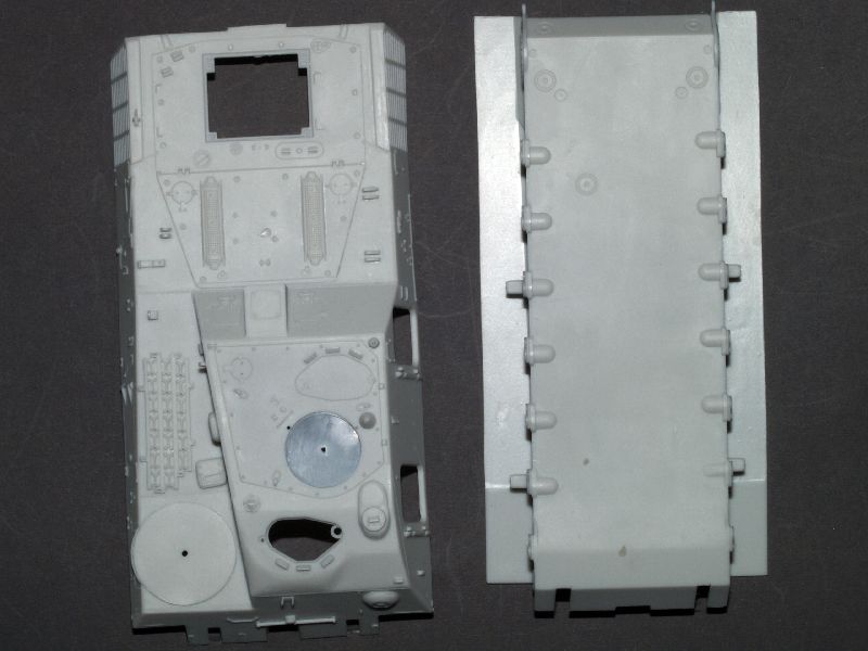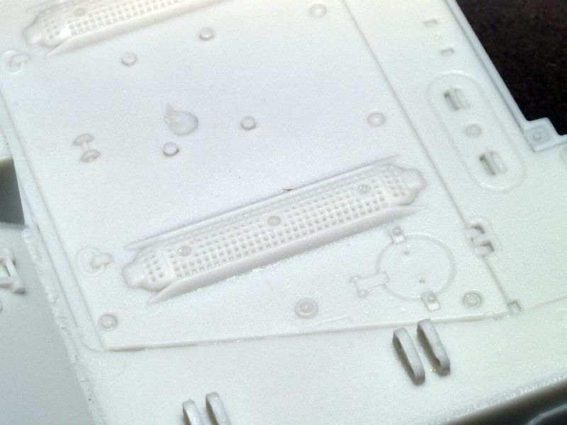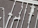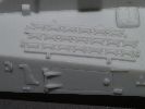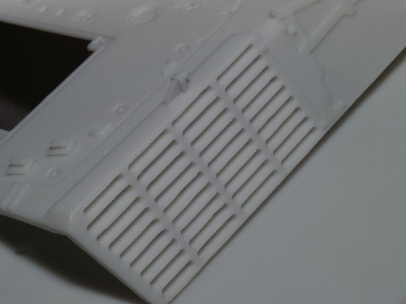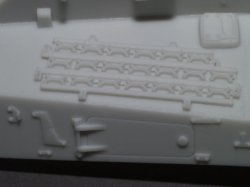 Der eigentliche Knaller sind aber die Resinteile. Verzug ist bei diesen Teilen ein Fremdwort; selbst bei so großen Teilen wie der Wanne oder dem Kranausleger. Ebenso sind Lufteinschlüsse nur sehr selten zu finden. Bei den Angüssen wurde versucht, diese auf ein Minimum zu reduzieren, so daß man die Teile mit geringem Aufwand verbauen kann. An einigen Stellen findet sich eine dünne Fischhaut, welche sich aber sehr leicht mit einem scharfen Skalpell entfernen lassen. An einigen Teilen muss man aus Draht selber Teile fertigen. Das läßt sich aber rech einfach bewerkstelligen. Die Detailierung der einzelnen Teile ist gigantisch. Allein die Oberwanne ist der Hammer. Aber auch beim Werkzeug ist die Detailierung erste Sahne. Dies sind nur zwei Beispiele.