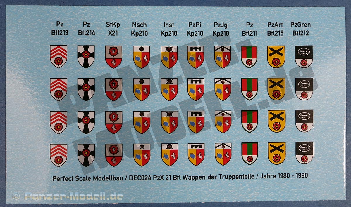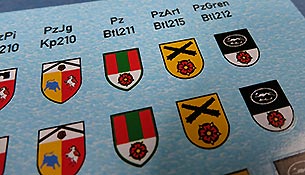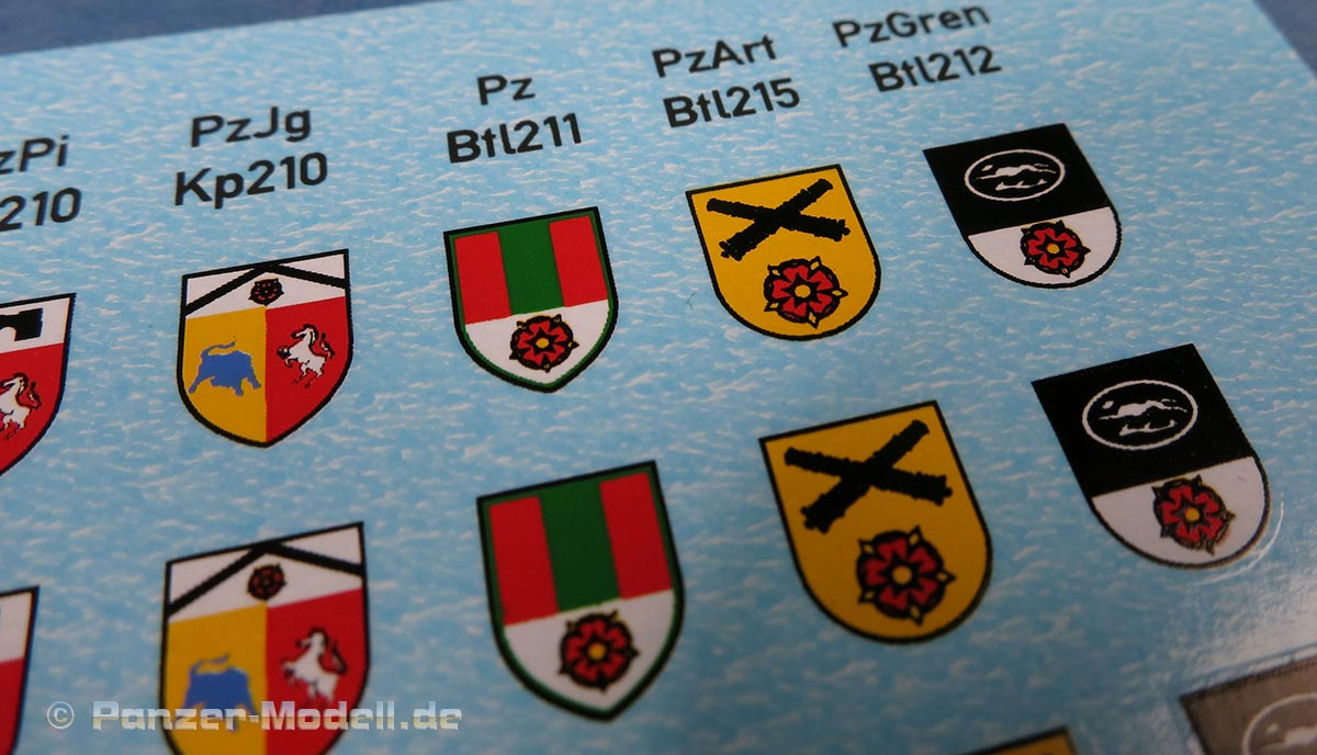 Die Decals zeigen die jeweiligen Embleme von Tuppenteilen wie den Panzerbataillonen 211, 213 und 214, Panzergrenadierbataillon 212, Panzerartilleriebataillon 215, der Stabskompanie X21 und den Nachschub-, Instandsetzungs-, Panzerpionier- und Panzerjägerkompanie 210.