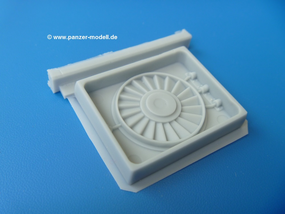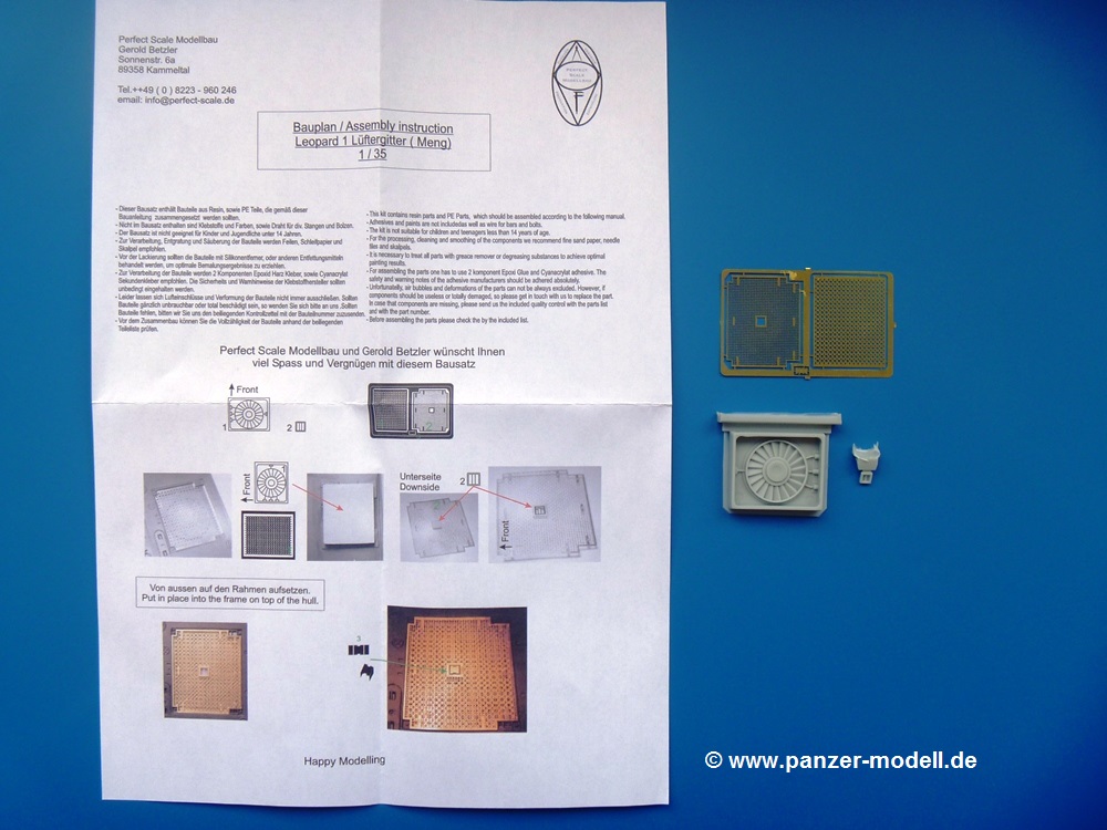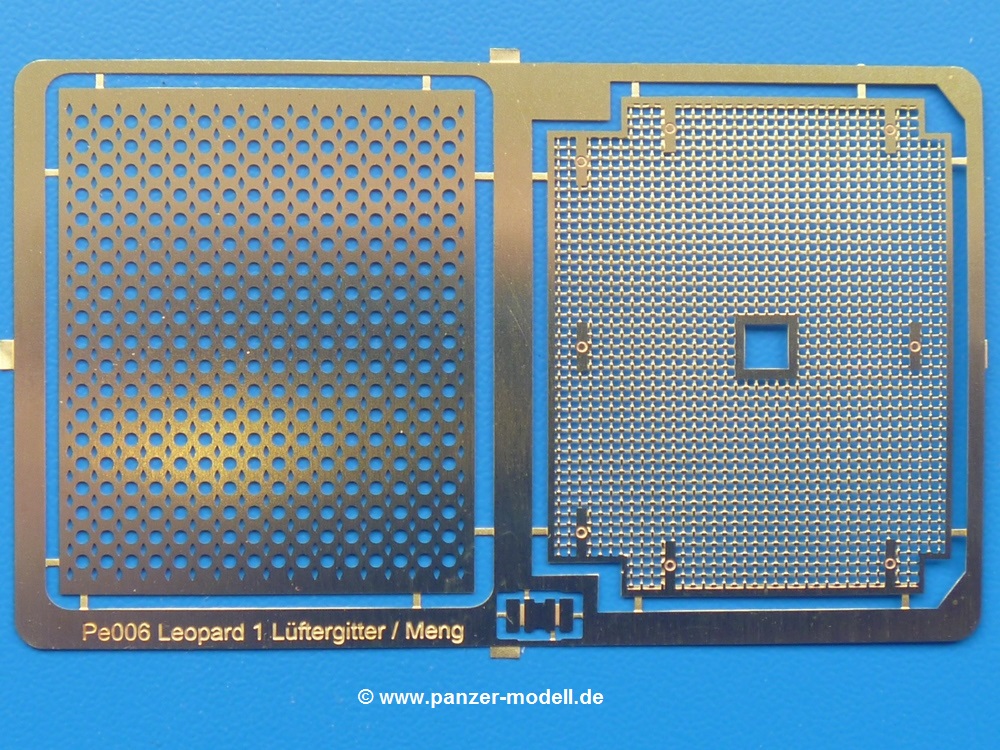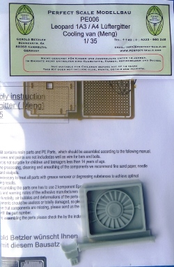 Das Original: Das Leopard 1 Fahrgestell besitzt in der hinteren Motorraumabdeckung einen großen Lüfter, der die Kühlluft ansaugt. Der Lüfter ist mit einem Drahtgitter abgedeckt, um ein Einsaugen z.B. von Blättern zu verhindern. Der Umbausatz: Speziell auf den Leopard 1 A3/A4 von Meng zugeschnitten liefert Perfect Scale hier den Lüfter. 2 Resin- und 3 Ätzteile bilden das schöne Set. Der Lüfterkasten mit dem Lüfterrad und den Anschlussleitungen ist das größte Teil aus Resin - verzugs- und blasenfrei. Dazu kommt noch der kleine Kasten, der später unter das Gitter geklebt wird. Auf den Lüfterkasten wird das geätzte Lochgitter gesetzt. Ein fantastisches Teil, das das Plastikteil von Meng würdig ersetzt. Auch das äußere Drahtgitter kann sich sehen lassen. Fast übersieht man das kleinste Ätzteil, das den mittleren Einsatz im Drahtgitter darstellt, der als Ansatzpunkt für das Hubgeschirr der Heckplatte dient. Eine Aufwertung des bereits guten Meng Leoparden. Für 8,50 Euro kann man den Satz sein eigen nennen. |