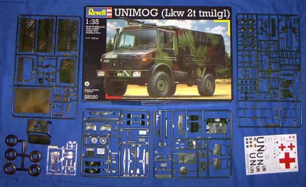 Katalognummer 03020 bietet Revell das Arbeitstier der Bundeswehr, den Unimog (LKW 2t milgl) an. Der Unimog besteht aus 190 Teilen an vier Spritzlingen. Einige Teile haben einen leichten Gussgrat, der aber einfach versäubert werden kann. Die Detaillierung ist etwas gröber als beim Fuchs, kann aber noch akzeptiert werden. Gewöhnungsbedürftig ist der Aufbau der Pritsche. Das Verdeck ist hier an die Seitenteile der Pritsche angegossen - will man das Fahrzeug also ohne Plane bauen, steht eine umständliche Trennarbeit ins Haus. Ärgerlich empfinde ich, daß die Pritsche innen nicht im geringsten detailliert ist - zumal das Verdeck am Heck geöffnet dargestellt wurde. Auch fehlen z.B. Sitzbänke für Soldaten - das wäre eine nette Dreingabe gewesen. Schön ist hingegen, daß man (im Gegensatz zum 10to MAN) den MG Drehring beigelegt hat - will man allerdings eine Figur ins Dachluk stellen (z.B. von Elite), so muß man das Kabinendach erst aufsägen - ein Durchbruch ist nicht vorhanden.