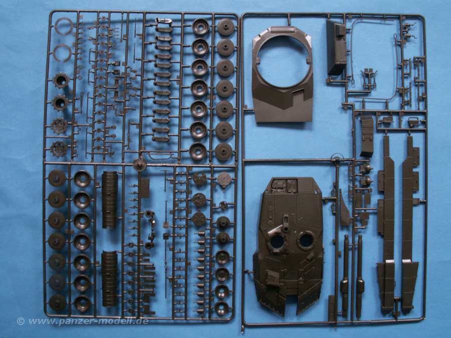 Der Bausatz umfasst 292 Teile an 5 Spritzlingen, wie auch Gummiketten in je zwei Teilen, Gittermaterial und einem Decalbogen. Dabei sind die Grundteile mit Turm, Wanne und Laufwerk bereits vom Leopard 2 A5 Bausatz bekannt. Neu ist eigentlich nur ein zusätzlicher Spritzling mit Zusatzteilen, wie dem DARKAS, Rohrwischergestänge und Granaten mit Transportboxen, sowie ein geänderter Spritzling mit Turmteilen und der langen L/55 Kanone, die die richtige Detailierung aufweist, gerade an der Verbindungsstelle der Wärmeschutzhülle zum verlängerten Stück. Aber auch die kürzere L/44 kanone ist enthalten, d.h. wer mag, kann auch den Leo 2 A5 bauen.
