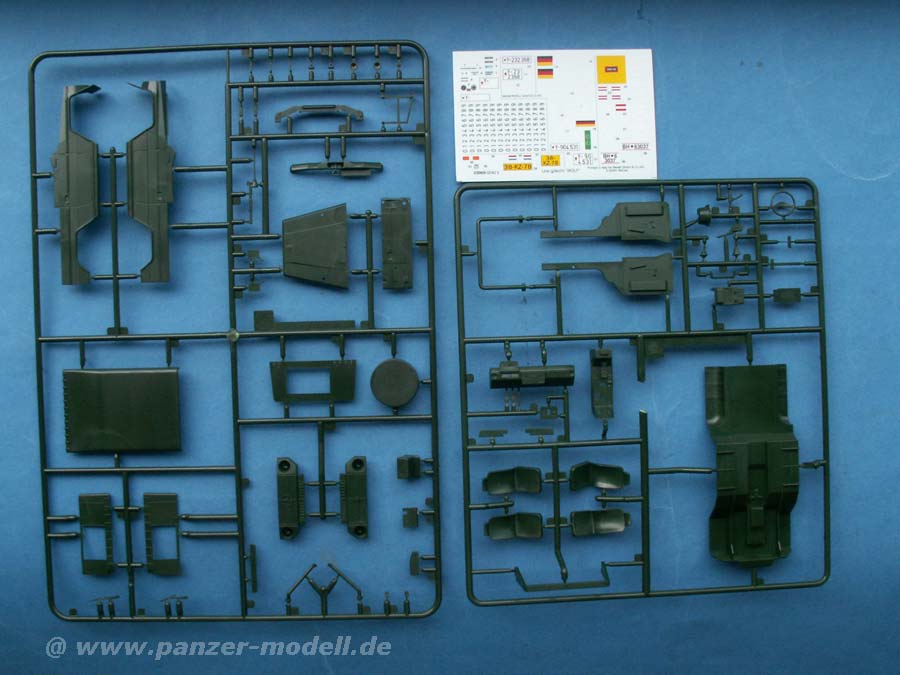 Der Bausatz umfasst etwas über 110 Teile an 3 Spritzlingen, wie auch Vinylreifen, Stahldraht und einen Decalbogen.
