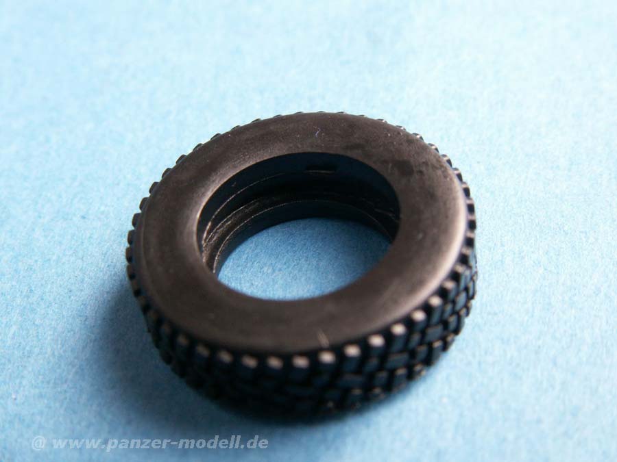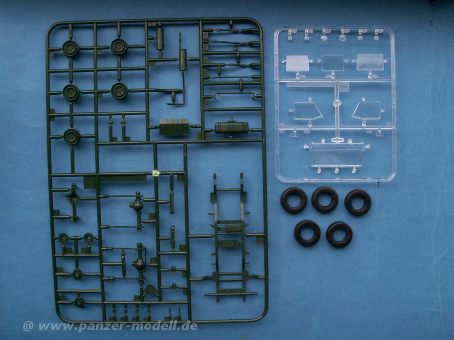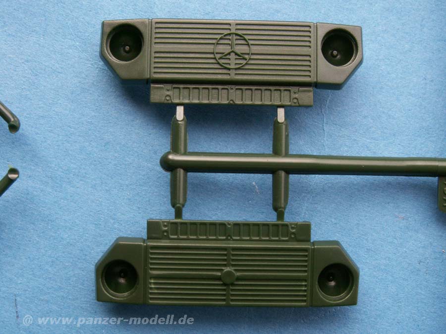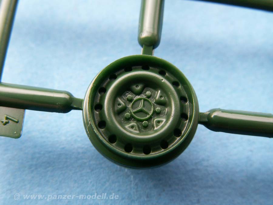Dafür gibt es umsomehr erfreuliche Sachen, denn in der Hauptsache ist das Modell ein echter Reisser und stellt den Wolf absolut gut dar - sogar die Reifen (bislang immer eher in Manko bei Revell) machen einen ordentlihen Eindruck - zwar ist wieder mal kein Herstelleraufdruck zu finden, am Original muss man allerdings auch auf weniger als 1m an die Reifen rangehen um zu sehen, dass dort ein Aufdruck ist - also alles im Rahmen. Richtig gut ist die Tatsache, dass man zwei verschiedene Kühlergrills eingepackt hat, um neben dem Mercedes Wolf auch die österreichischen Puch bauen kann. Desweiteren sind die Scheinwerfer hohl und die Gläser aus durchsichtigem Plastik - man kann also richtig realistische Scheinwerfer basteln.
