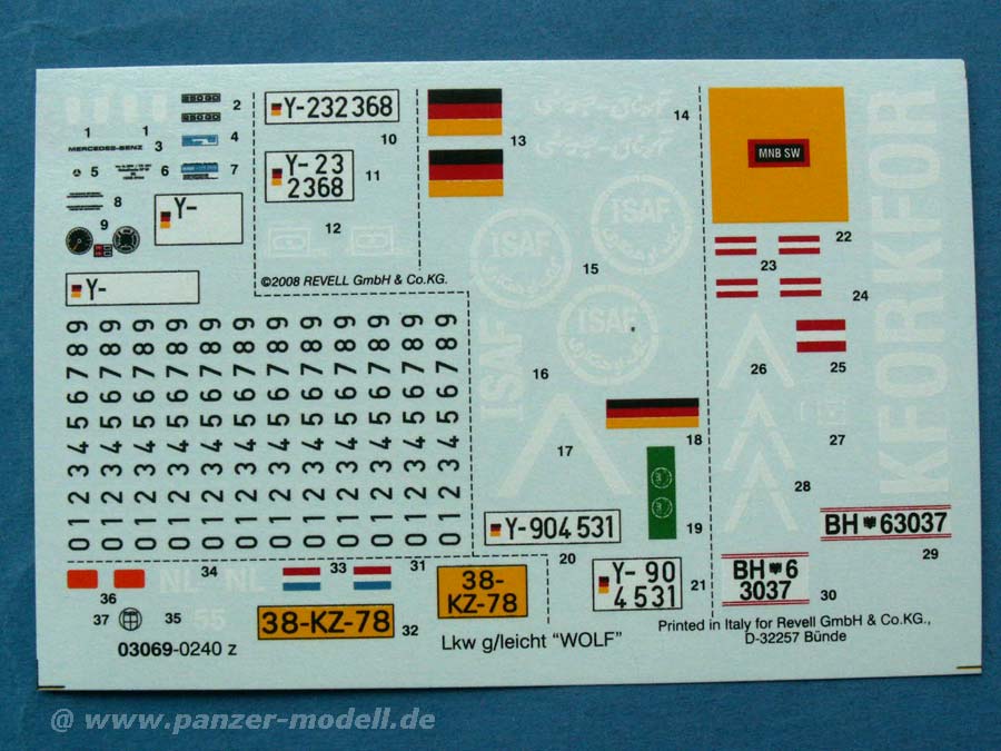 Ein weiteres DICKES Plus gibt es für den Decalbogen, denn der ist mal richtig durchdacht und bietet so richtig auswahl - auf den ersten Blick mag es mager erscheinen mit zwei Bundeswehr Varianten 1./PzArt.215 und GECON ISAF, sowie einer österreichischen KFOR und niederländischen Version, aber allein die Tatsache, dass man die Nummernschilder mit einem umfangreichen Zahlensatz selbst gestalten kann, ist ein große Schritt in die richtige Richtung - zusammen mit anderen taktischen Zeichen (z.B. von Truck line) kann man fast jeden beliebigen Wolf der Bundeswehr bauen.