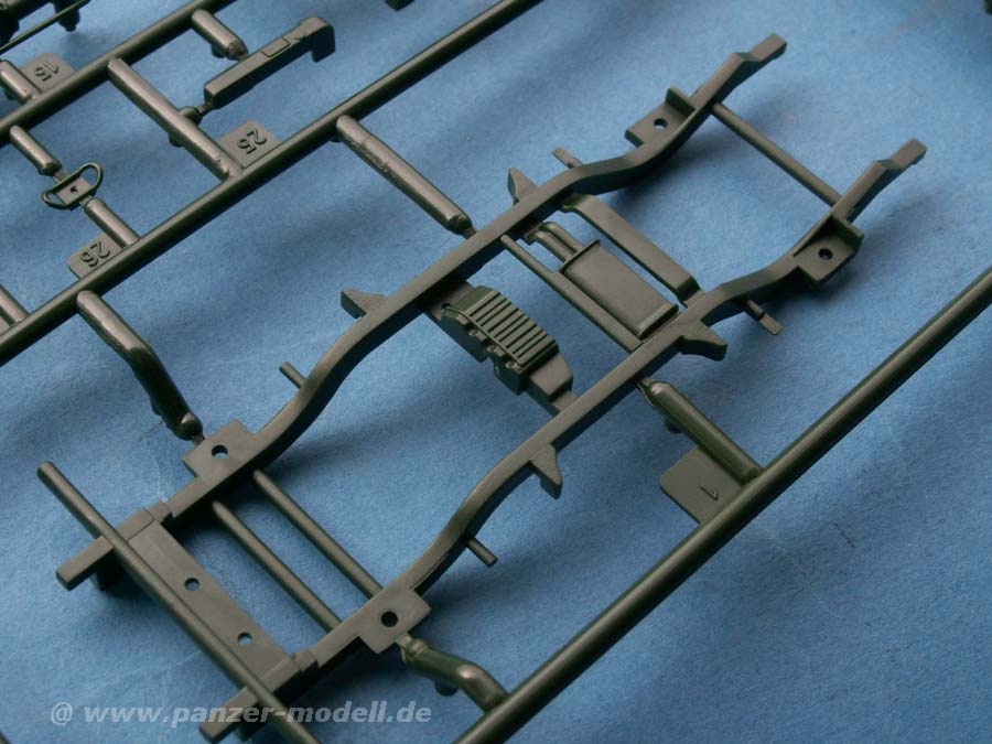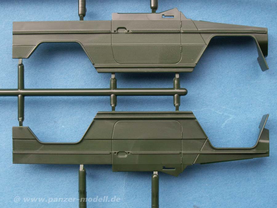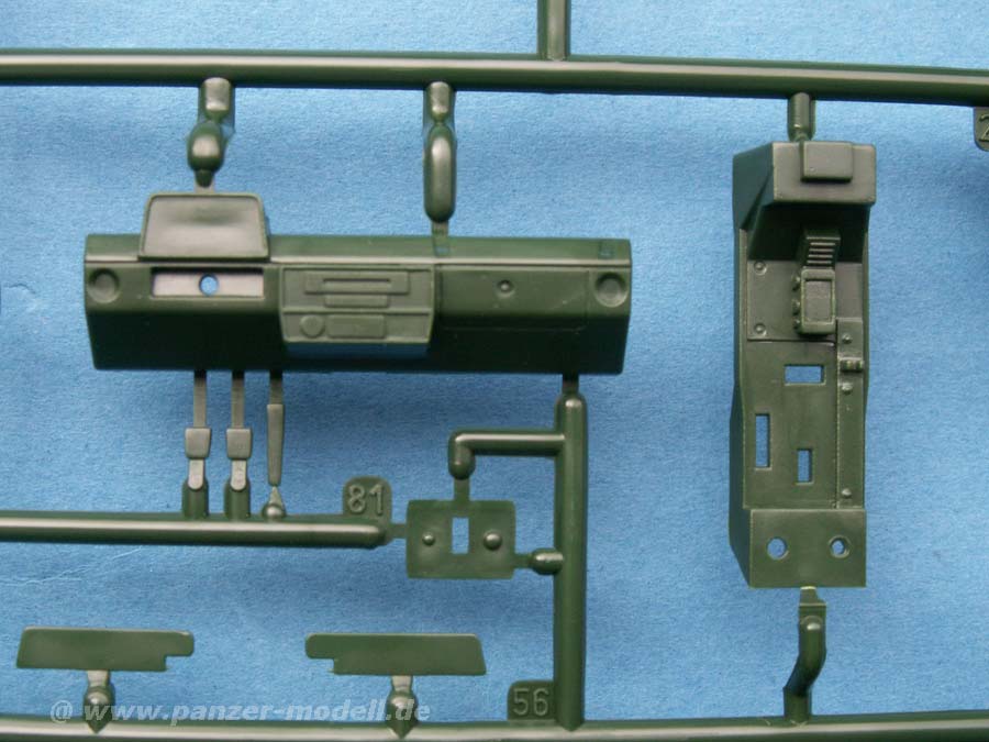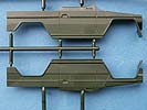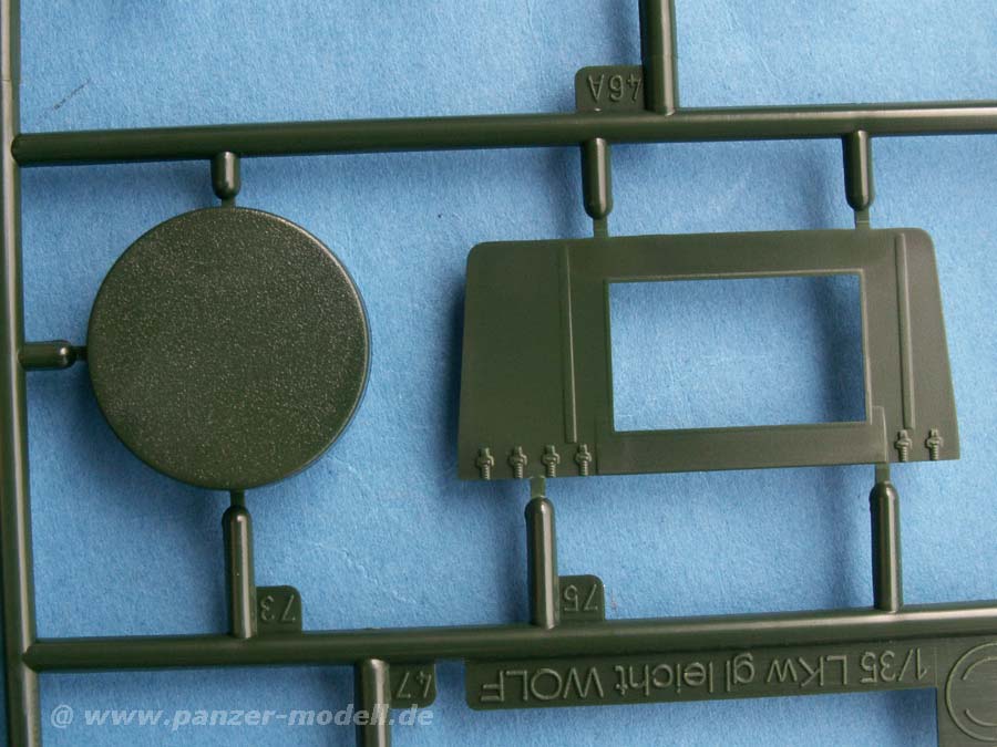 Alle Teile sind natürlich absolute Neuentwicklungen, da es den Wolf vorher nichtmal ansatzweise gab. Die Qualität ist richtig gut, hie rhat Revell einen Schritt nach vorn getan. Die Detailierung der Teile weiss zu gefallen und alle wichtigen Features sind richtig umgesetzt. Einzige Mankos, die mir bei der Durchsicht so auffallen sind die Sitze, die einfach zu glatt und gerade sind und nicht auf Polsterung vermuten lassen, sowie die Reserveradabdeckung die so glatt gemacht ist als währe sie aus Stahlblech, in echt aber eine verzurrte Plane ist und daher Falten aufweisen sollte. Das Dach, das ebenfalls als Plane gemacht ist, ist mir persönlich auch etwas zu glatt und eben - aber das nur minimal. Die Innenausstattung ist ansonsten ok, wenn auch hie rund da etwas vereinfacht, was aber im Innenraum absolut vertretbar ist