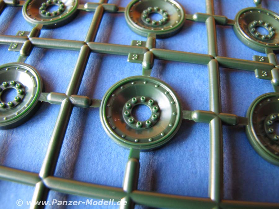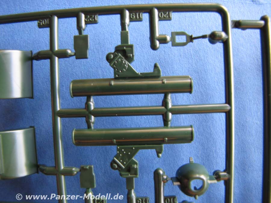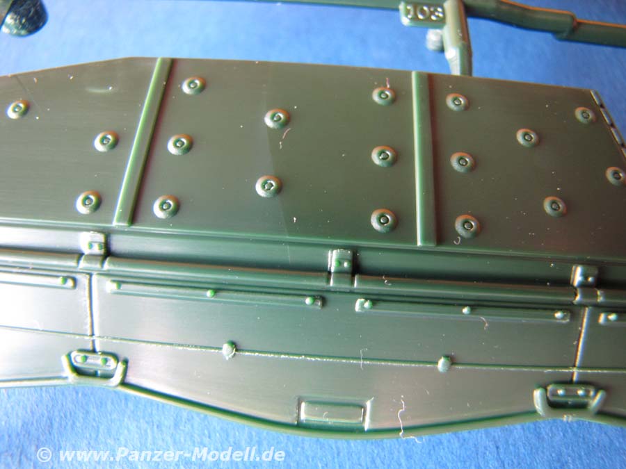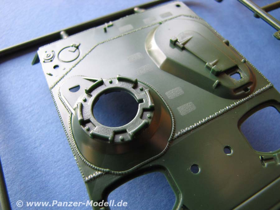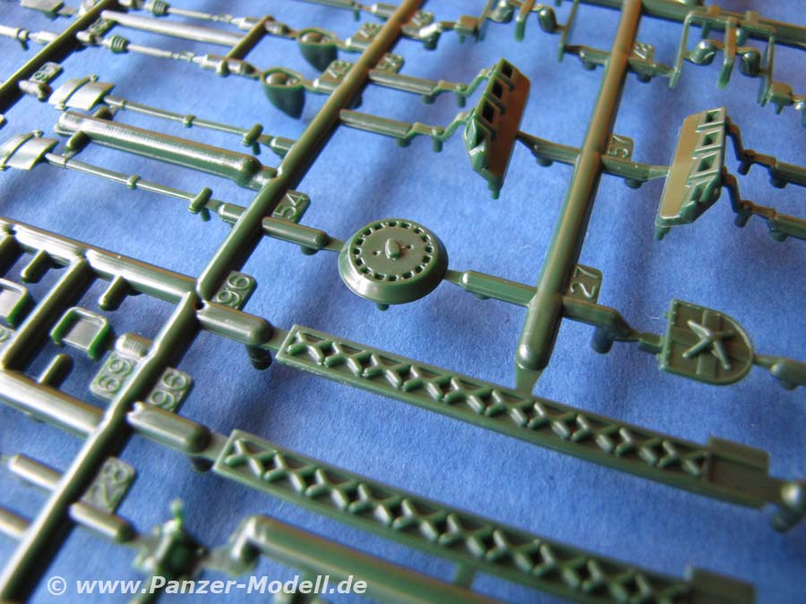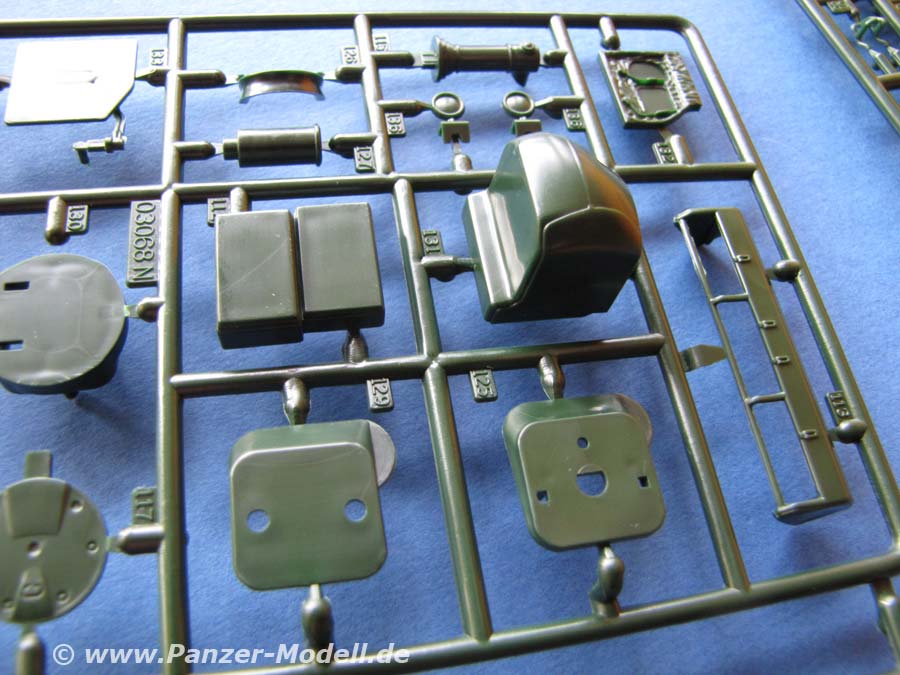 Den Großteil der Teile mit Motordeck und Wanne mit Laufwerk kenn man bereits vom KaJaPa mit seinen Stärken und Schwächen - allgemein machen diese aber qualitätstechnisch einen guten Eindruck. Neu sind der Aufbau mit Frontplatte mit den Zusatzpanzerungen, die schürzen und natürlich auch das Aufbaudach mit Waffenanlage. Die Detailierung der neuen Teile weiss durchaus zu gefallen und alle wichtigen Features sind soweit richtig umgesetzt.