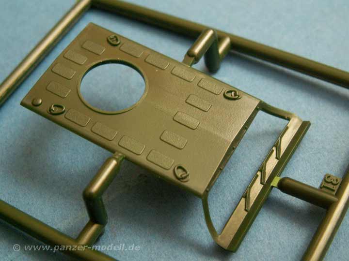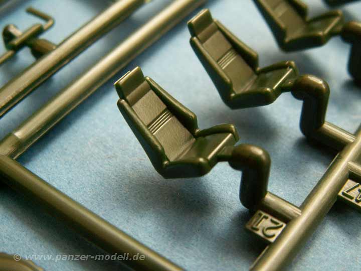 Das Chassis ist schön nachgebildet und gut detailiert, der Unterboden Minendeflektor ist auch gut dargestellt, der Innenraum ist mit Schalensitzen und Armaturen ausgestattet, die recht ordentlich sind, zumal man durch die winzigen Scheiben eh nicht viel sieht. Die Oberflächendetails sind sauber und ansprechend und sogar die Antirutschbeschichtungen sind dargestellt, wenn auch ein wenig zu dick, aber da kann man ja etwas schleifen.