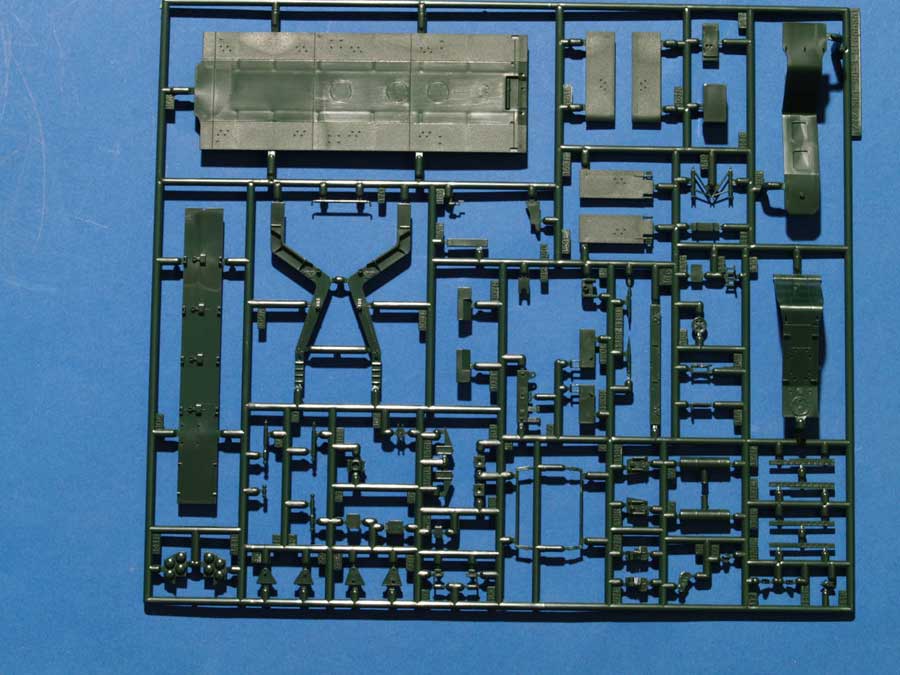 Die Qualität der Teile ist alles in allem recht gut geraten. Offensichtlich hat Revell die Formen nochmal korrigiert, da bei meinem Bausatz die Ladefläche (Teil 105) zweifach vorhanden ist. Die separate Ladefläche hat deutlich weniger Sinkstellen. Ansonsten halten sich die Sinkstellen in Grenzen, resp. sind so angebracht, daß sie nicht weiter ins Auge fallen. Leider können die Achsen dnicht beweglich dargestellt werden. Wer dies darstellen möchte, muß also zu Messer und Säge greifen. Weitaus ärglicher ist allerdings die Tatsache, daß Revell auf jegliches Verzurr-Material wie Ketten oder Seile für die Winden verzichtet hat. Hier muß der Käufer ebenfalls selbst Hand anlegen.