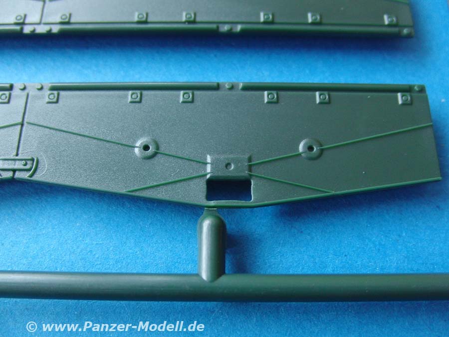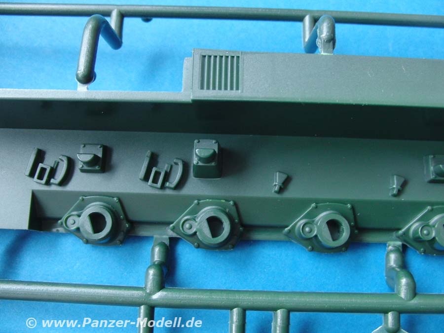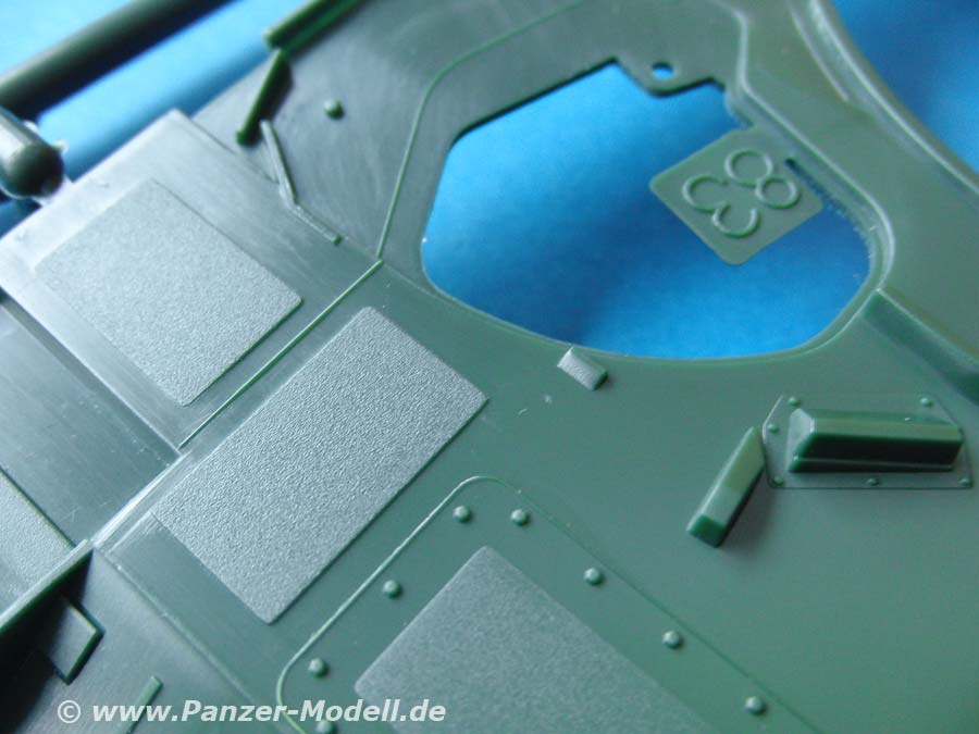 Die Bauteile machen für Revell einen ganz hervorragenden Eindruck und weit ab vom früheren Leopard 2 Bausatz. Klare, deutliche Details, die schön dargestellt sind. Sauberer Guss ohne Formenversatz oder Verzug und gut strukturierte Aufteilung der Bauteile.