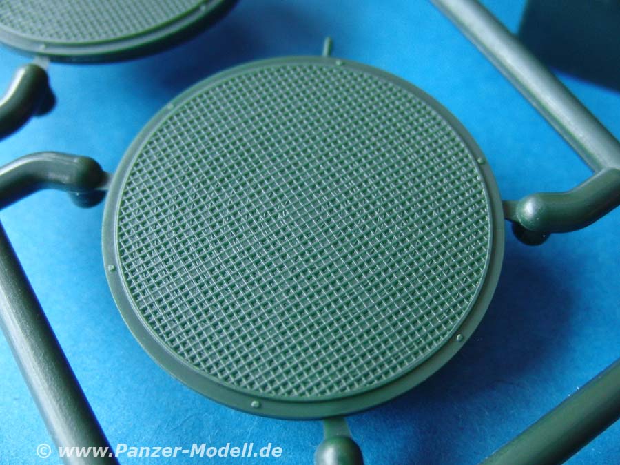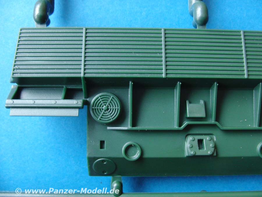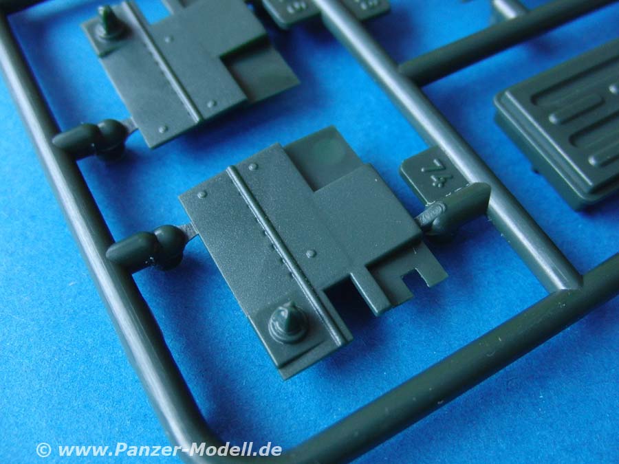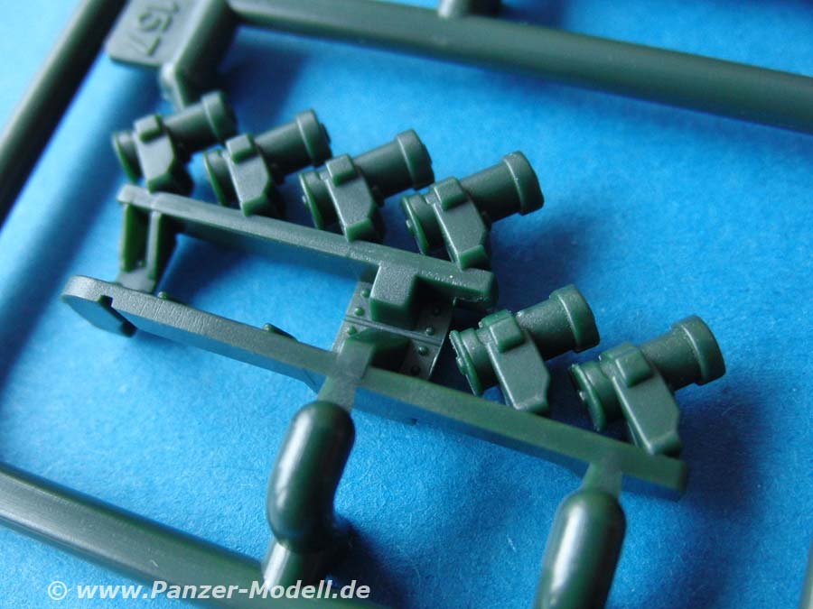 Der Turm stellt sehr schön den kantigen A4 Turm dar. Zudem bietet er die wichtigen Optionsteile der Fla-Waffe, Nebelwurfbecher und Antennenbasen. Zudem liegt auch die zusätzliche Kiste der NL Version auf dem Turmdach bei. Die deutsche Nebelwurfanlage erscheint mir leider ohne Fächerung der Becher zu sein.