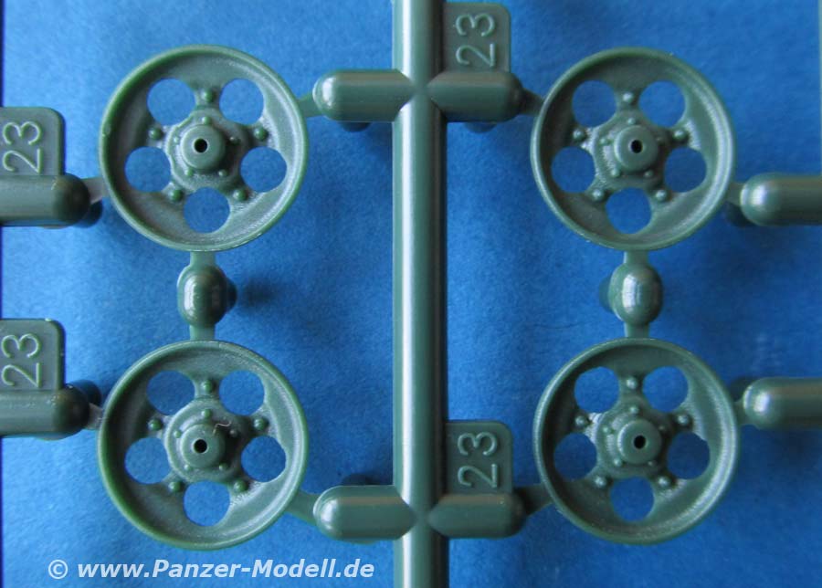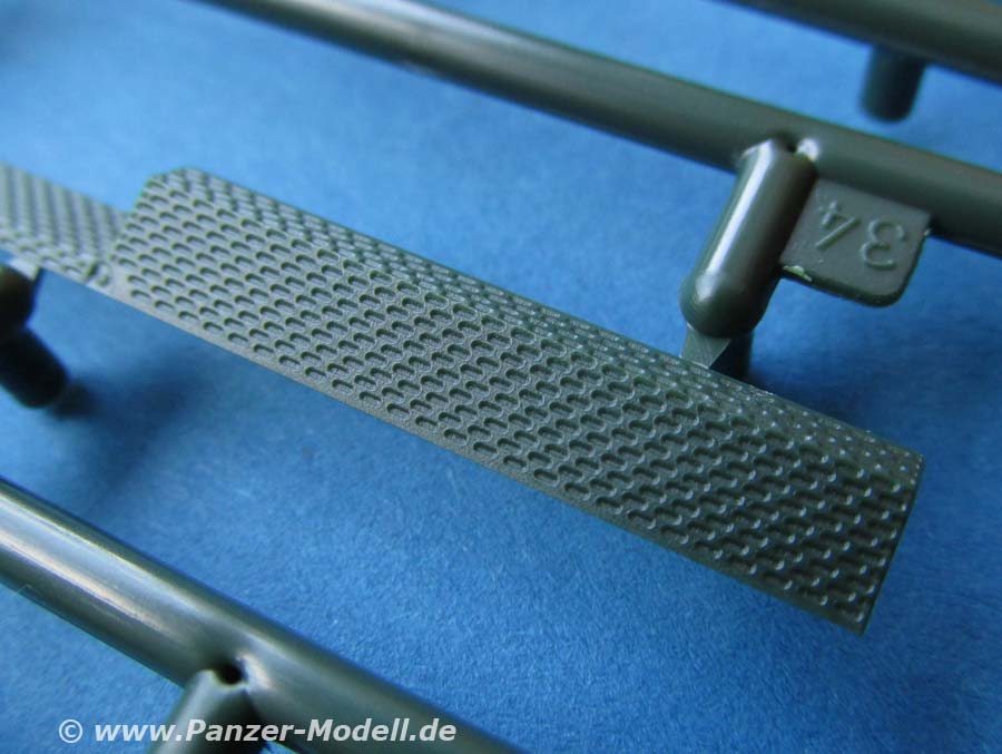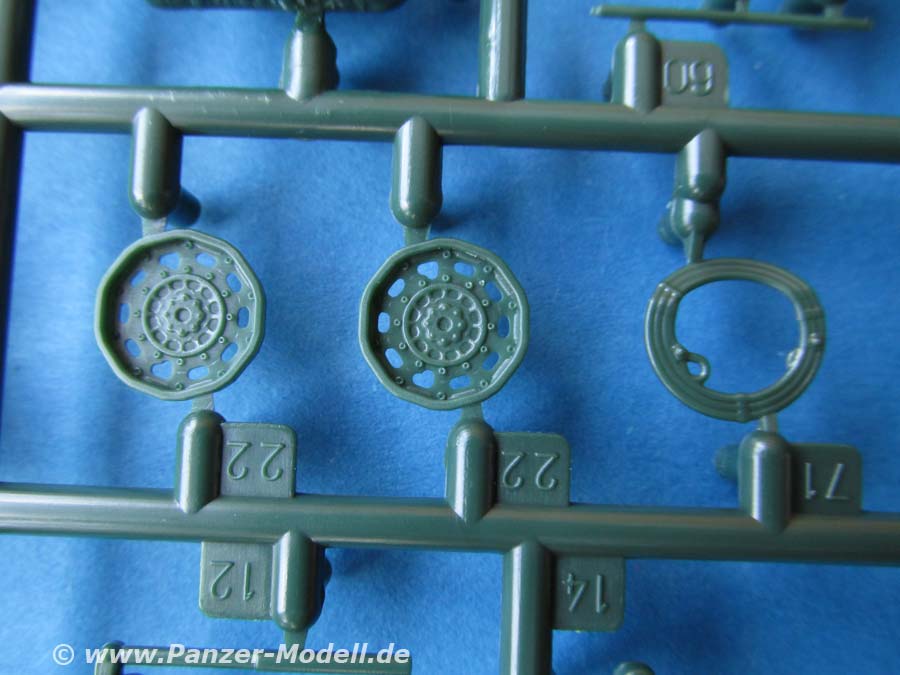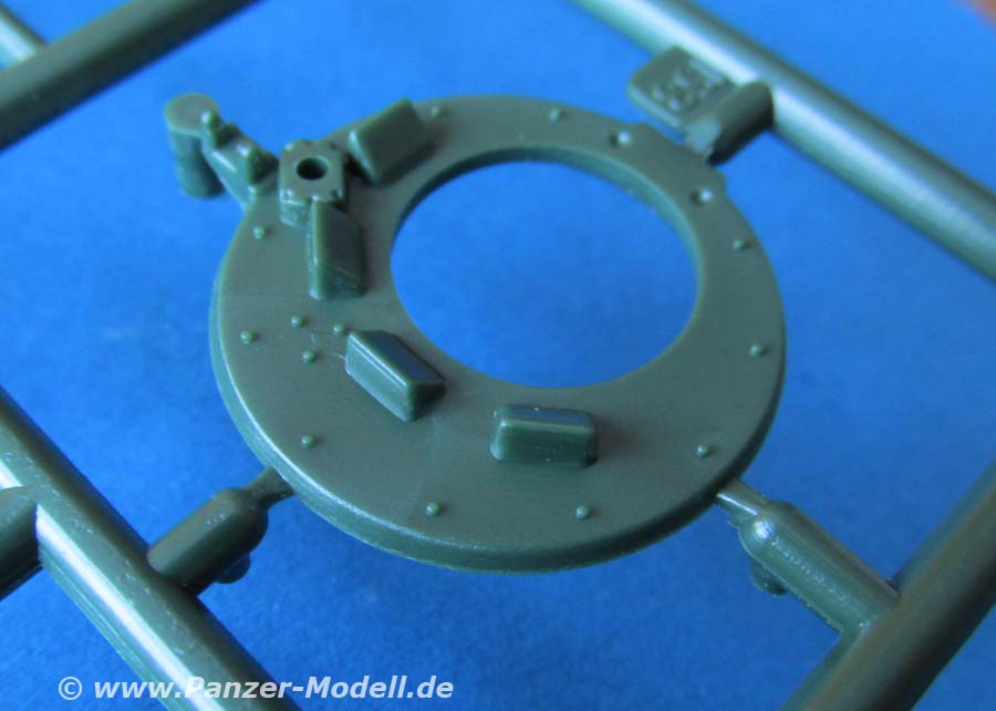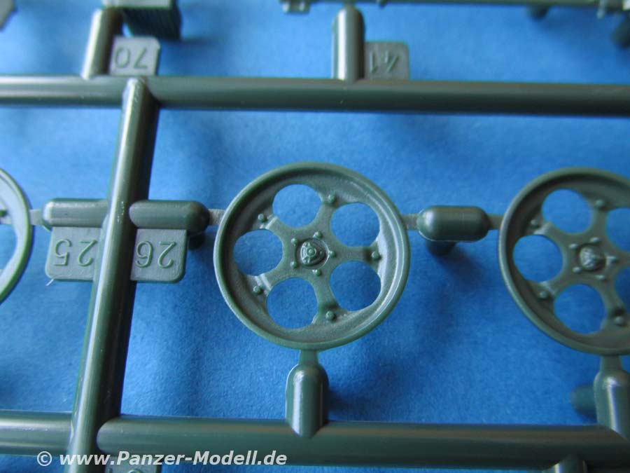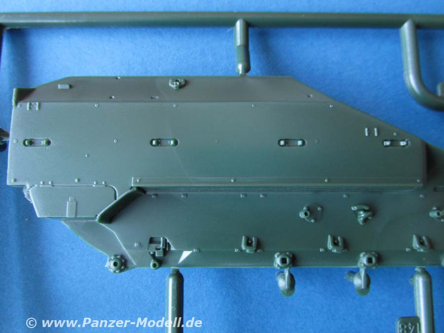 Die Passmarken in den Wannenteilen macht den Zusammenbau aber erträglich und ohne große Spalten baubar. Für das Laufwerk liegen auf für diese Version die ganz neuen Laufrollen bei, die am Wiesel 2 erst ab ca.2008 verwendet werden. Die Details hier lassen sich aber durchaus sehen und der Guss ist sauber. Dies gilt im übrigen auch für die Wanne an sich mit den Details auf der Oberwanne und auch die Antirutschflächen sind ganz passabel dargestellt und keinesfall übertrieben dick wie man es früher schon auch von anderen Herstellern erlebt hat.