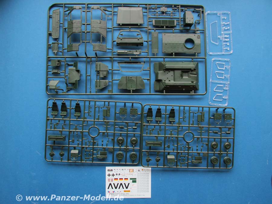Der Bausatz umfasst über 200 Teile an 10 Spritzlingen (2 davon als Klarsichtteile), Vinylreifen, Draht und einen Decalbogen.