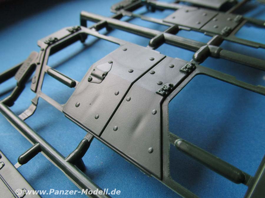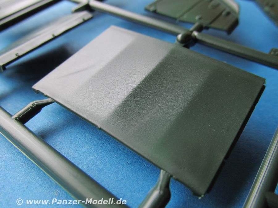 Schön ist auf der einen Seite die Darstellung der Antirutschbeschichtungen auf dem Dach - leider sind diese eine Spur zu dick geraten. Dies gilt auch für die Naht auf der Motorhaube, die ungewöhnlich ausgeprägt dargestellt ist. Mit einem Skalpell ist diese aber schnell entfernt.