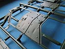 Der Leiterrahmen ist mehrteilig ausgeführt, was für schöne Details spricht, den Zusammenbau aber etwas kompliziert. Die Achsen sind komplett mit Antriebssträngen, Federung, Stabilisatoren und Co dargestellt. Und auch Getriebe und Motor sind im Bbausatz enthalten. Alles in bekannter Revell Qualität. Wer an der Vorderachse die Kanten etwas feilt, kann die Vorderräder sogar mit Lenkeinschlag darstellen.