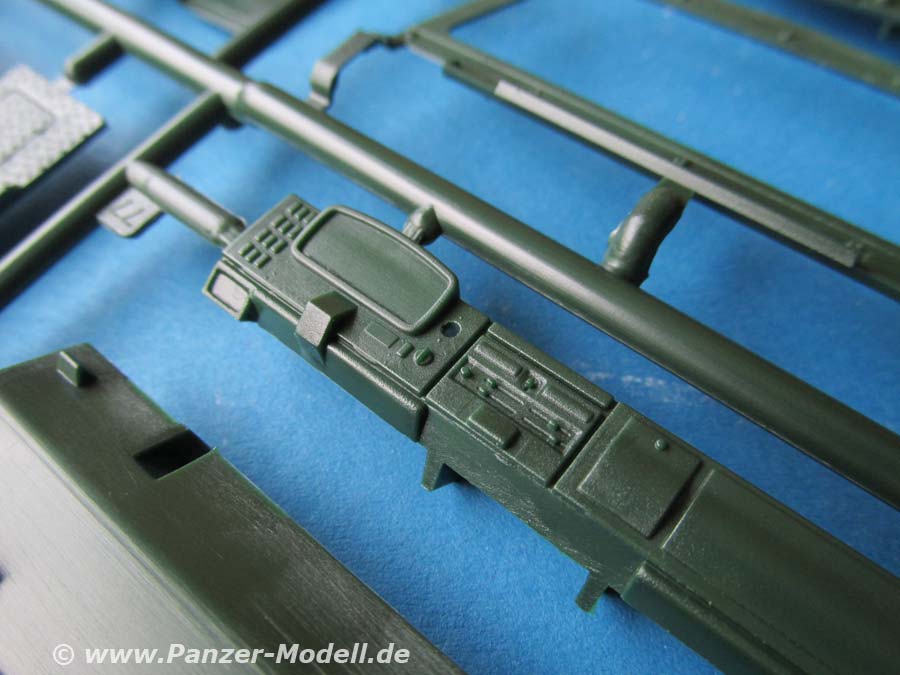 Der Aufbau ist mehrteilig, was nicht unbedingt jedermanns Sache ist und durchaus seine Gefahren beim zusammenbau birgt. Die Darstellung der Details und die Einbettung der Fensterteile ist jedoch sehr gelungen. Die Türen lassen sich wahlweise offen oder geschlossen bauen. Leider lässt die Darstellung der Plane des Laderaums im Heck sehr zu wünschen übrig, denn diese wirkt absolut steif und leblos wie ein starrer Aufbau.