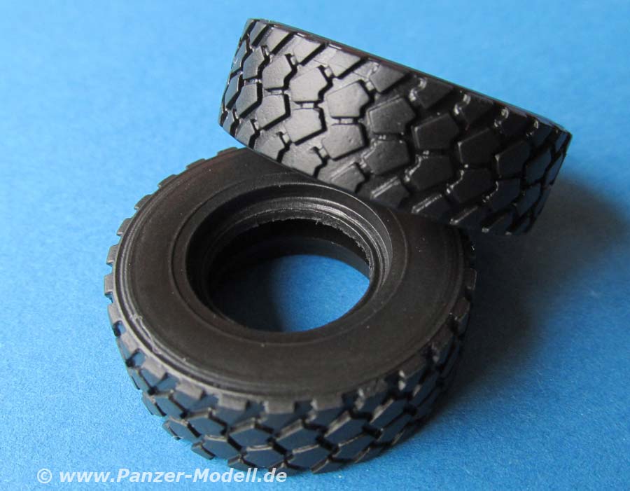 Die Reifen sind aus recht hartem Vinyl mit gut gemachtem Profil - dafür wieder einmal ohne Seitenaufdruck. Vielleicht erbarmt sich ja ein Zurüsthersteller mit schönen neuen Reifen aus Resin.