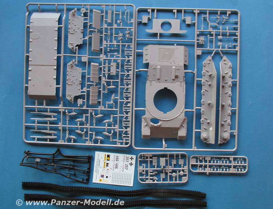 Im Karton finden sich 9 graue Spritzlinge, ein Spritzling in weichem Vinyl, 2 Vinylketten und ein Decalbogen.