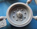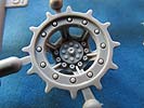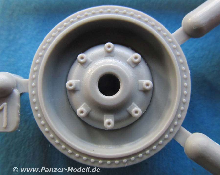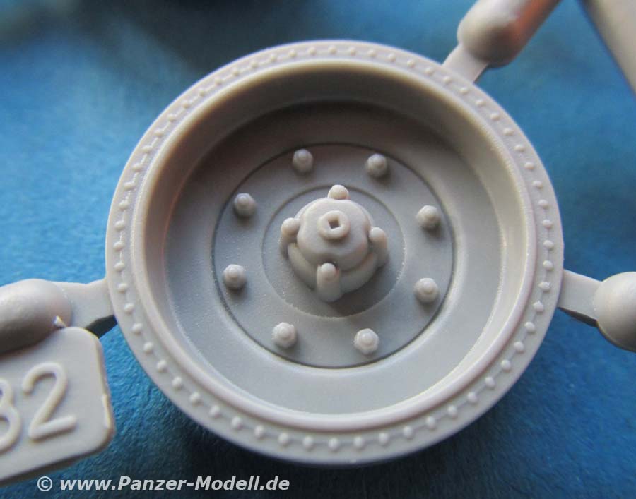 Die Schwingarme werden einzeln eingeklebt, sind aber definitiv fest und nicht in der Höhe beweglich baubar. Die Laufrollen sind per se sehr gut gemacht und fein detailliert dargestellt, sogar auf der Innenseite der Laufrollen sind die entsprechenden Details angebracht. Was mich etwas irritiert, bzw. stört, sind die dich recht markantenm deutlichen runden Erhebungen rundherum an der seite der Laufrollengummis. man kann zwar auf Originalfotos solche Strukturen erkennen, aber diese sind selbt am Original quasi eben mit dem Gummi - in 1:35 also deutlich übertrieben. Aber mit einem Bastelmesser oder Feile sollte sich dies schnell in den Griff kriegen lassen. Dafür ist die Form der Felge an sich inkorrekt, denn Revell hat diese quasi mit einer deutlichen Kante dargestellt, während die Originale in eine Wölbung übergehen.