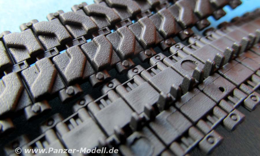 Die Kette stellt erfreulicherweise den korrekten frühen D139E2 Typ mit den markanten Gummiwinkeln dar und ist für eine Vinylkette erstaunlich fein und detailliert gemacht. Leider zeigen sind auf den Innenseiten von ein paar Gliedern ein paar Auswerferstellen, die man unter Laufrollen verstecken muss, da sie recht unangenehm sind.