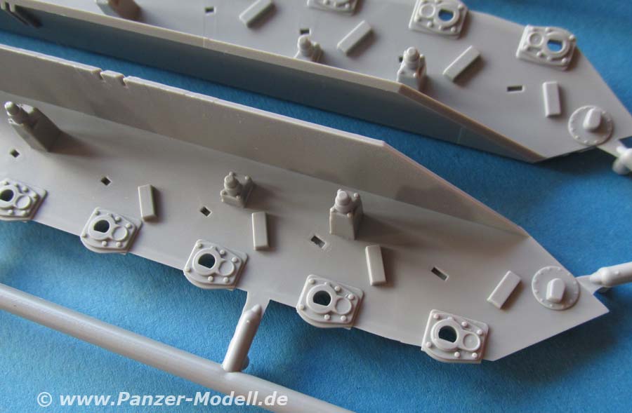 Die Oberwanne besteht quasi aus einem Teil, bis auf zwei große Seitenteile, die separat eingeklebt werden - auf diese Weise konnte Revell die doch recht unterschiedlichen Auslegungen der deutschen und niederländischen Version zu realisieren. Hier bin ich positiv angetan von den Werkzeugen, bzw. den Staukisten der Holländer mit erstaunlich schönen und feinen Details. Besonders gelungen finde ich die Darstellung der vorderen Kettenabdeckbleche mit dem Riffelblechmuster, das man nur bei den frühen Baulosen findet.