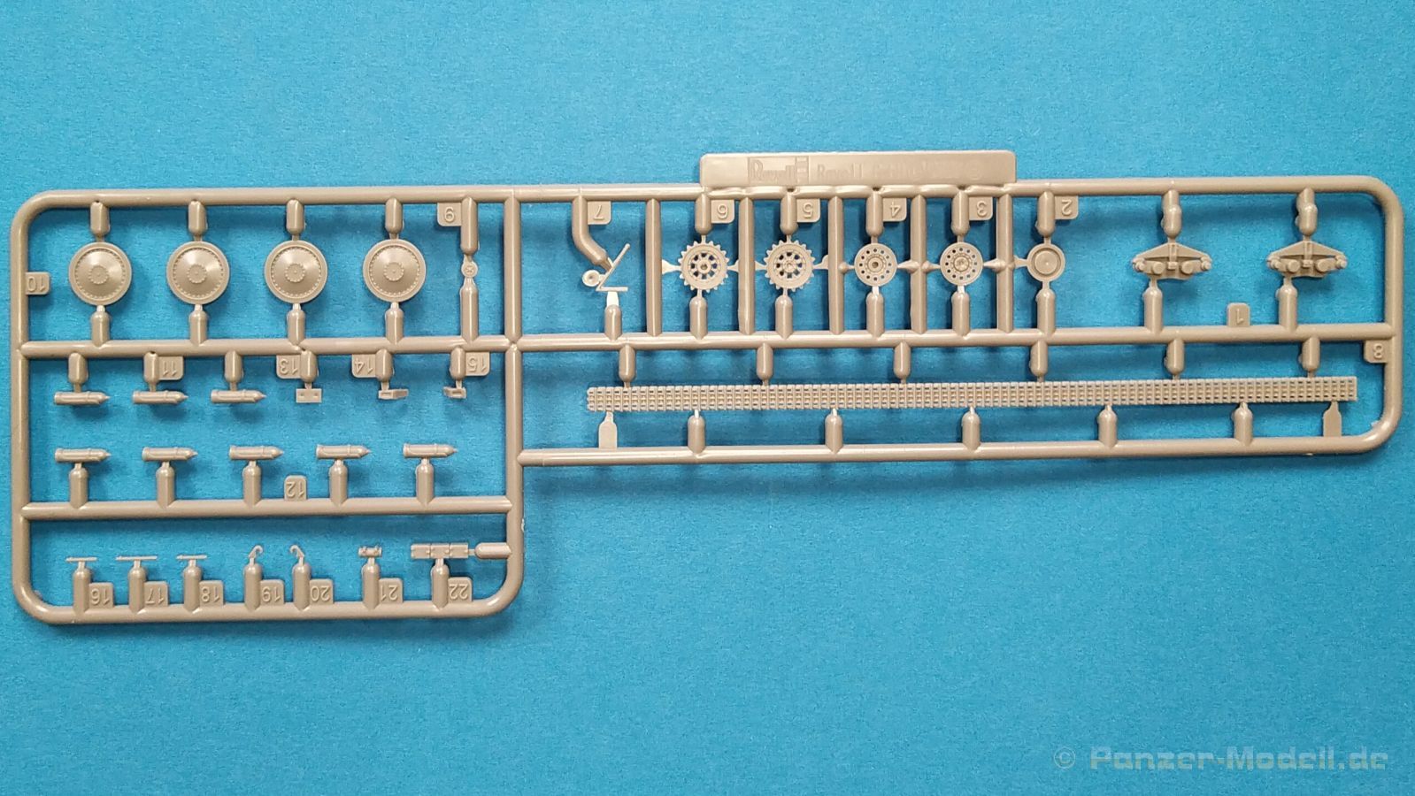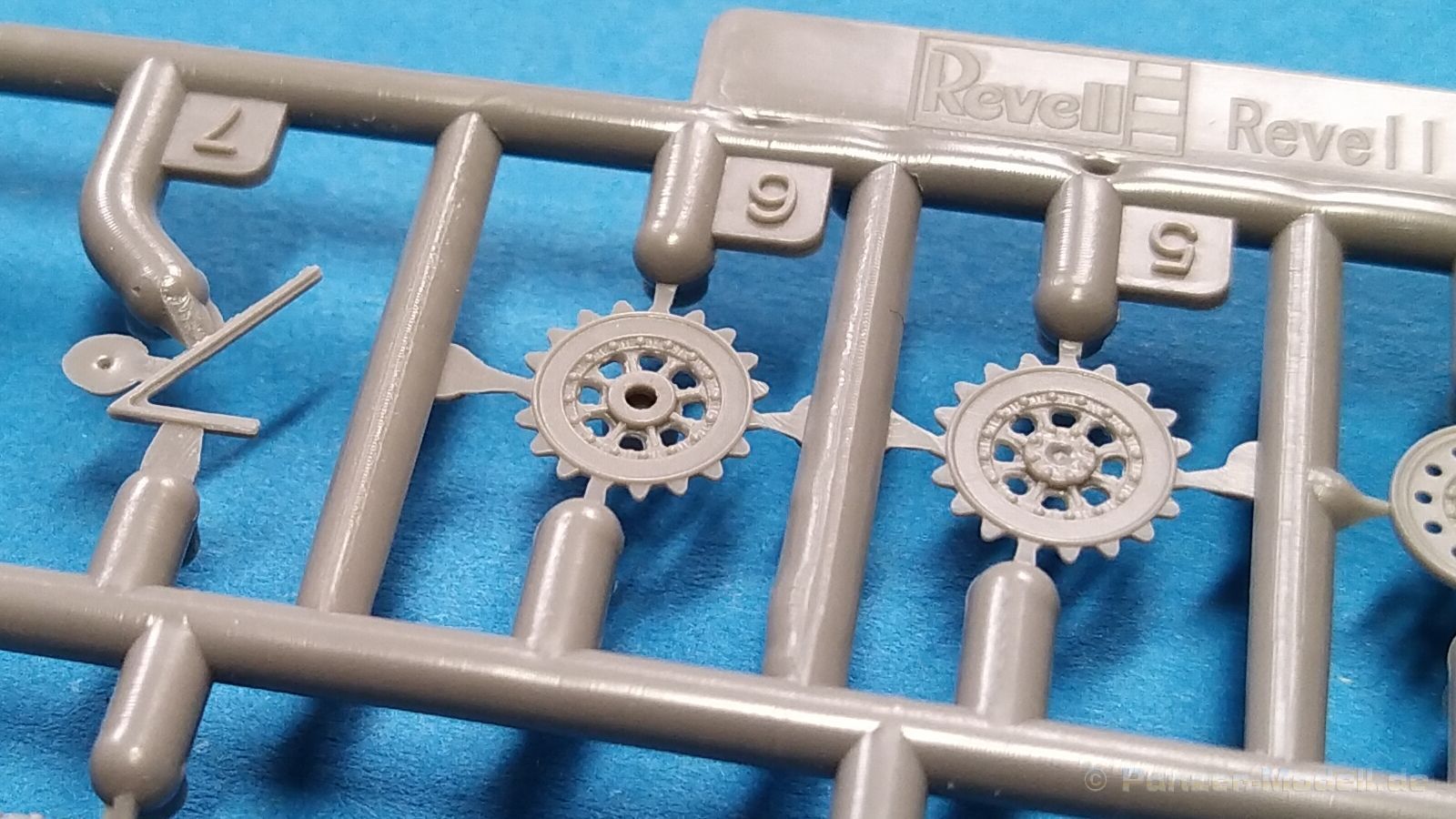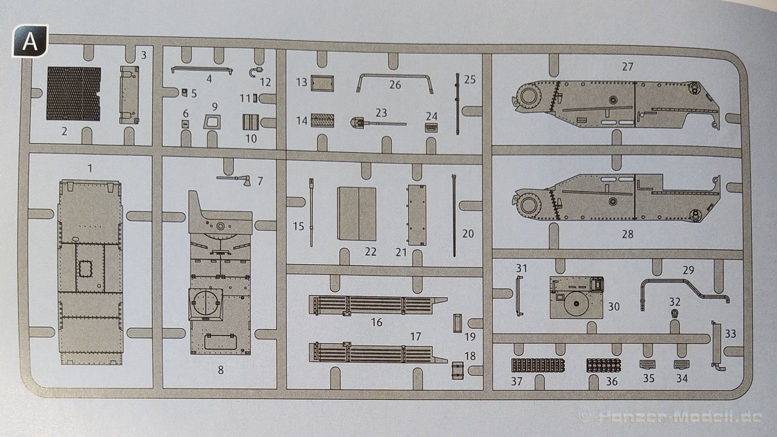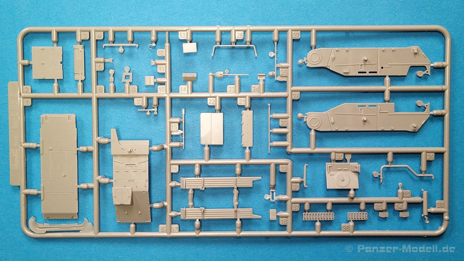 Der erste Eindruck nach Öffnen des Kartons ist gut. Die Teile wurden sauber gespritzt und weisen eine gute Detailierung auf. Es gibt zwar zahlreiche Auswerfermarken, diese aber weites gehend nur an später nicht mehr sichtbaren Stellen. Bei näherer Betrachtung finden sich lediglich im Bereich der Ketten einige Marken, die evtl. später sichtbar werden, falls Sie nicht von den Laufrollen und Fahrwerksteilen abgedeckt werden. Also kein großes Problem. Neben einigen Sinkstellen (nur im Bereich der Rahmen) finden sich auch einige Fischhäute die etwas den guten Gesamteindruck trüben. Diese lassen sich aber leicht entfernen. Die Angüsse sind teilweise etwas groß ausgefallen, dies ist aber dem kleinen Maßstab geschuldet. Die Bausatzdetaillierung ist aber ansonsten gut und weist als Highlights die offene Darstellung von Kanone und Auspuff dank Slide-Mold-Technik auf. Die Wanne und der Kampfraum sind aus einzelnen Teilen winklig zusammenzusetzen, dies geht aber dank dem Aufbau der Teile problemlos. Die Detailierung des Kampfraumes ist spritzgussbedingt etwas einfacher ausgeführt, weiß aber zu gefallen. Es wurde alles Notwendige dargestellt und bietet eine gute Grundlage für eine weitere Detailierung. Die markanten Bauteile wie die 38 t typischen Nieten und die Trittbleche wurden gut dargestellt ohne übertrieben stark zu wirken. Die Fahrerluke kann leider nur geschlossen dargestellt werden. Im Bereich der Wanne bzw. dem Laufwerk fallen die stark vereinfachten Federblöcke negativ auf. Diese sind leider ohne Struktur wiedergegeben, werden aber weites gehend durch die Laufrollen verdeckt. Wie bei anderen Revell-Modellen gelöst, sollen auch bei diesem Bausatz die einteiligen Ketten nach dem Versäubern gebogen werden und anschließend ans Laufwerk angepasst werden. Hier wären sicherlich Segmentketten die schönere Lösung gewesen. Bei der Detailierung von Gittern und Lochblechen ist den Spritzgussteilen sicherlich eine Grenze gesetzt. Deshalb sollte man die Kiste auf dem linken Fender, die Auspuffabdeckung und das Gitter an der rechten Seite für eine bessere Detailierung gegen Ätzteile austauschen, oder die Teile aufbohren bzw. dünner schleifen. Auch die Darstellung der Antennen, Spriegel und diverser Griffe ist in den beiliegenden Spritzgussteilen des Bausatzes maßstäblich zu dick. Hier erreicht man aber durch die Verwendung von Draht schnell Verbesserungen in der Detailierung. Positiv fallen die losen Werkzeuge, das mehrteilige Funkgerät und die einzelnen Granaten auf, die der Detailierung des Modells zuträglich sind. Die Kampfbeladung (Munition) ist komplett aufgefüllt dargestellt. Das Geschütz bleibt in eingebautem Zustand beweglich. Die Heckklappe kann entgegen der Angabe in der Bauanleitung für einen Feuerkampf auch offen angeklebt werden. Die Bauanleitung ist zweisprachig ausgelegt. Es gibt Hinweise in englischer und deutscher Sprache. Zu Beginn findet man eine Übersicht der enthaltenen Spritzlinge, Decals, etc. Gefolgt von kurzen Erläuterungsgrafiken und Handlungsanweisungen. Anschließend folgt eine Übersicht mit Farbangaben zu revell-eigenen Farben. Im Weiteren folgt die eigentliche Bauanleitung, die sich in 34 Baustufen gliedert. Hier wird pro Baustufe anhand von mehrfarbigen 3D-Zeichnungen Schritt für Schritt der Weg zum fertigen Modell dargestellt bzw. erklärt. Die letzten beiden „Baustufen“ (33 u. 34.) sind dann auch schon die zwei verschiedenen Farb- und Markierungsvarianten. Folgende Versionen sind hier dargestellt: