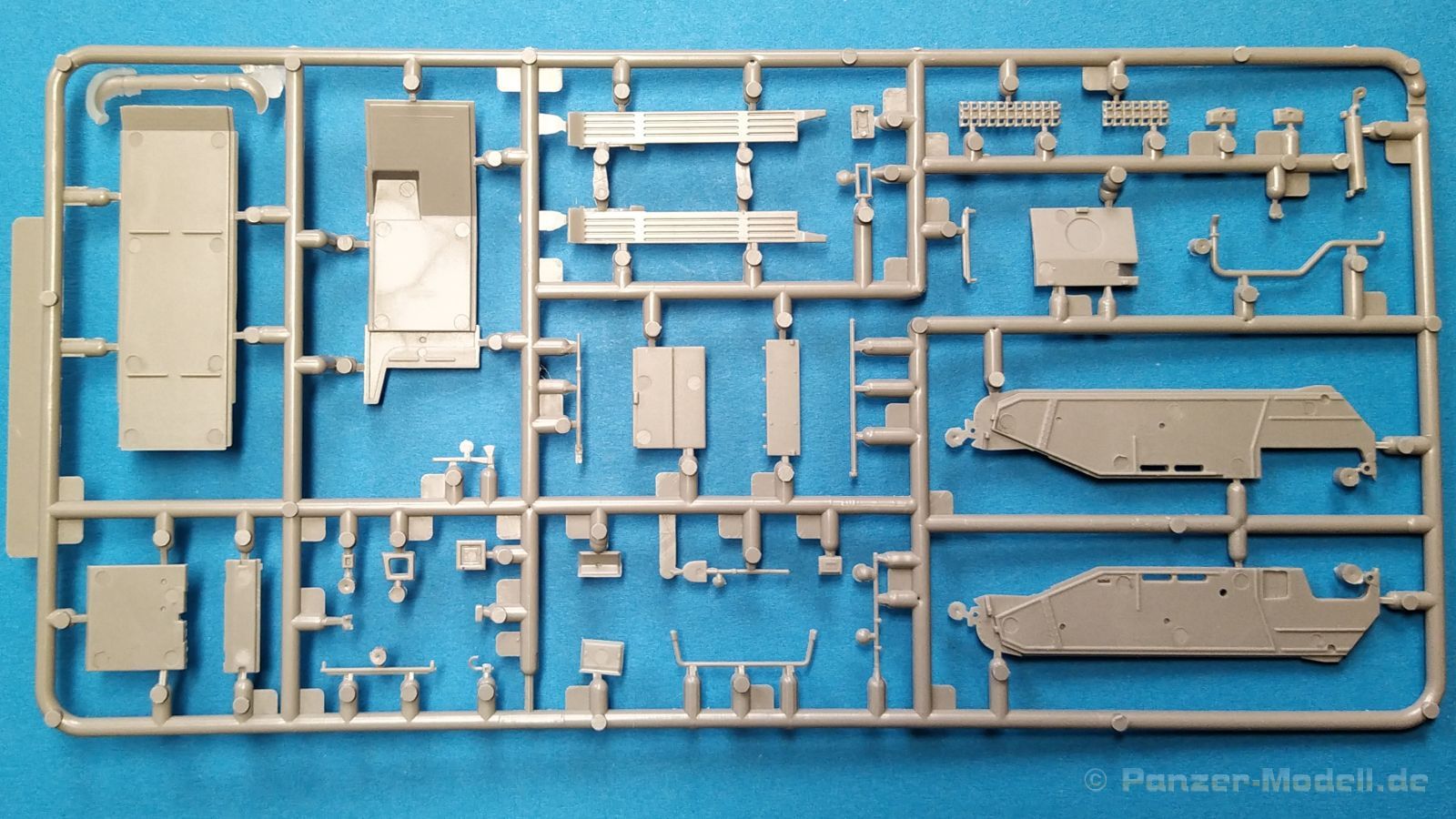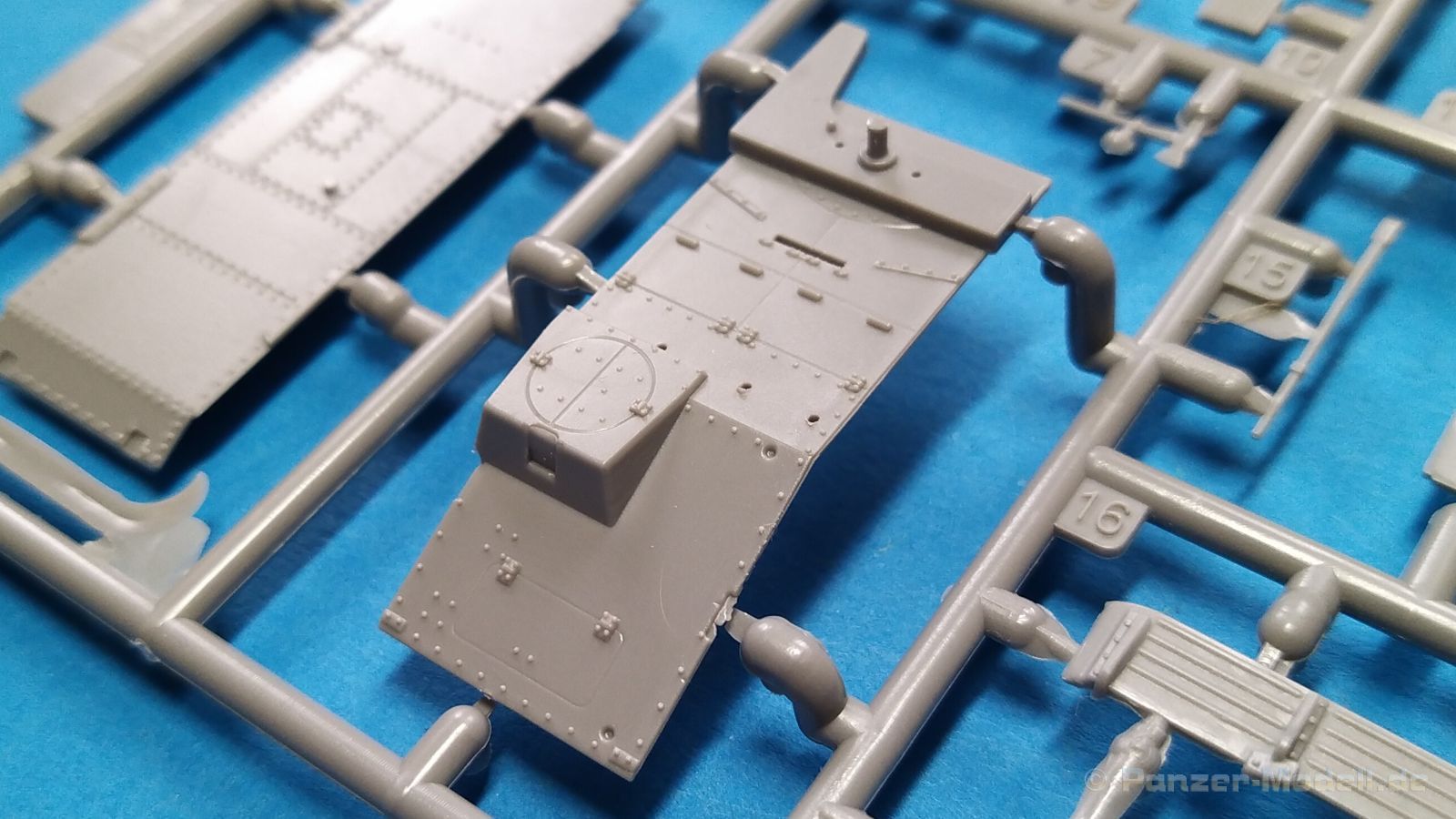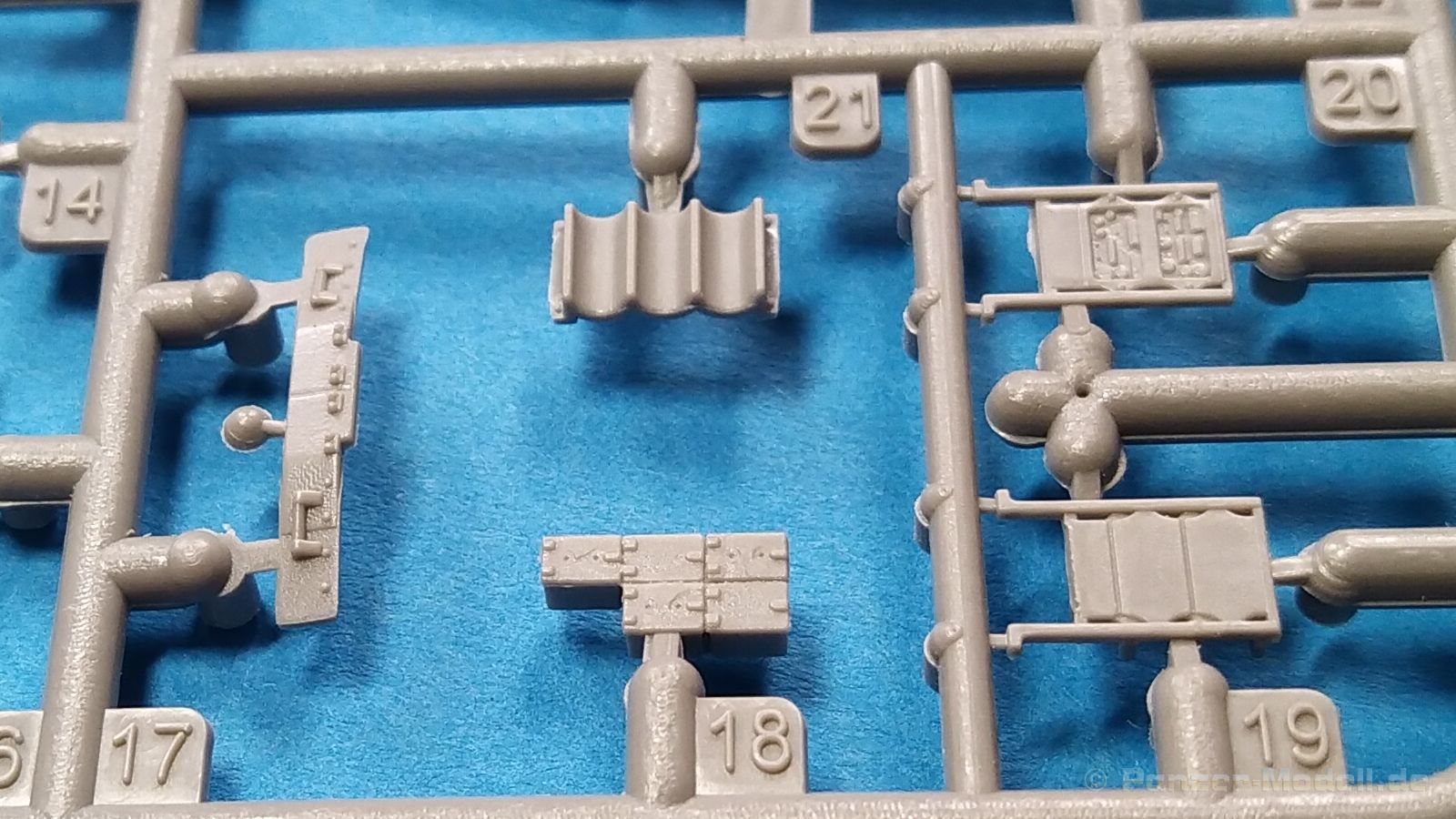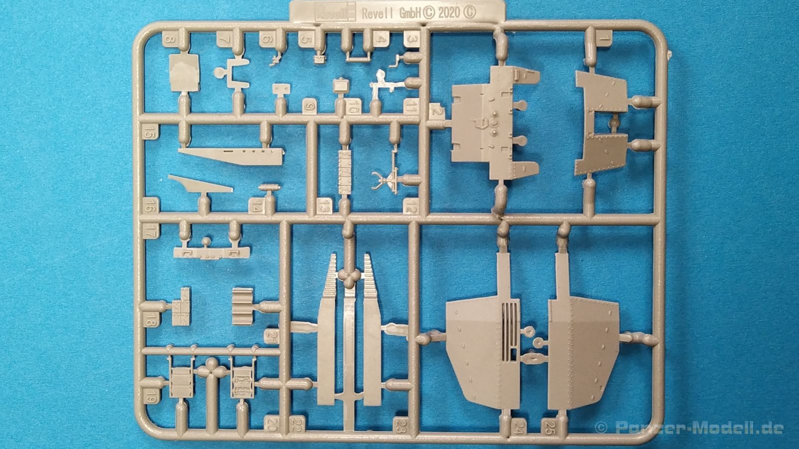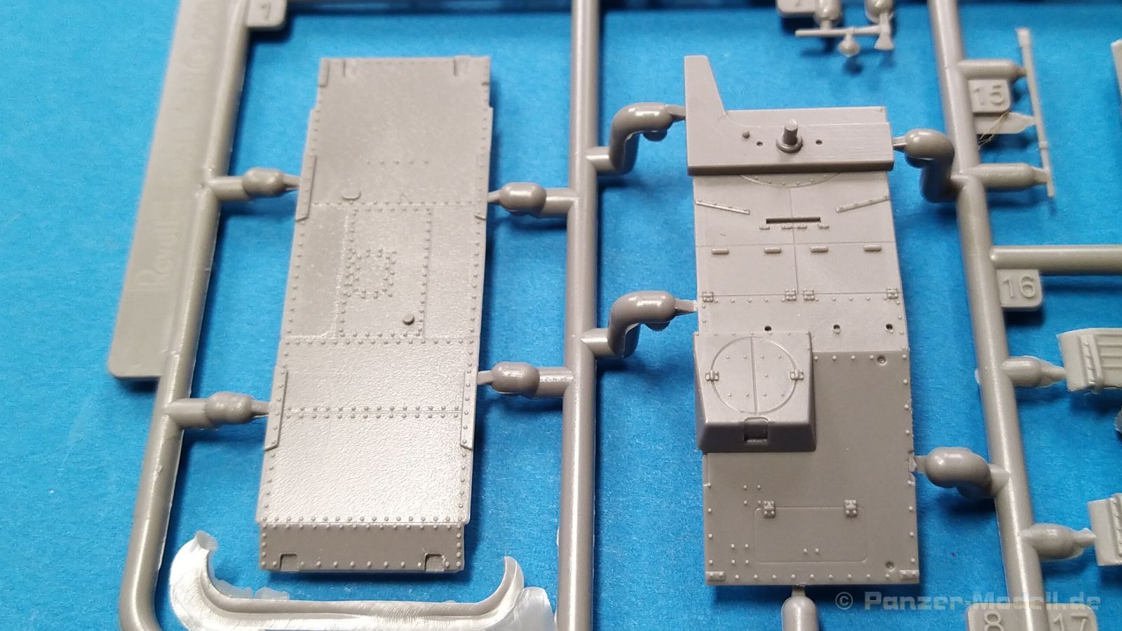Der erste Eindruck nach Öffnen des Kartons ist gut. Die Teile wurden sauber gespritzt und weisen eine gute Detailierung auf. Es gibt zwar zahlreiche Auswerfermarken, diese aber weites gehend nur an später nicht mehr sichtbaren Stellen. Bei näherer Betrachtung finden sich lediglich im Bereich der Ketten einige Marken, die evtl. später sichtbar werden, falls Sie nicht von den Laufrollen und Fahrwerksteilen abgedeckt werden. Also kein großes Problem. Neben einigen Sinkstellen (nur im Bereich der Rahmen) finden sich auch einige Fischhäute die etwas den guten Gesamteindruck trüben. Diese lassen sich aber leicht entfernen. Die Angüsse sind teilweise etwas groß ausgefallen, dies ist aber dem kleinen Maßstab geschuldet. Die Bausatzdetaillierung ist aber ansonsten gut und weist als Highlights die offene Darstellung von Kanone und Auspuff dank Slide-Mold-Technik auf. Die Wanne und der Kampfraum sind aus einzelnen Teilen winklig zusammenzusetzen, dies geht aber dank dem Aufbau der Teile problemlos. Die Detailierung des Kampfraumes ist spritzgussbedingt etwas einfacher ausgeführt, weiß aber zu gefallen. Es wurde alles Notwendige dargestellt und bietet eine gute Grundlage für eine weitere Detailierung. Die markanten Bauteile wie die 38 t typischen Nieten und die Trittbleche wurden gut dargestellt ohne übertrieben stark zu wirken. Die Fahrerluke kann leider nur geschlossen dargestellt werden. Im Bereich der Wanne bzw. dem Laufwerk fallen die stark vereinfachten Federblöcke negativ auf. Diese sind leider ohne Struktur wiedergegeben, werden aber weites gehend durch die Laufrollen verdeckt. Wie bei anderen Revell-Modellen gelöst, sollen auch bei diesem Bausatz die einteiligen Ketten nach dem Versäubern gebogen werden und anschließend ans Laufwerk angepasst werden. Hier wären sicherlich Segmentketten die schönere Lösung gewesen. Bei der Detailierung von Gittern und Lochblechen ist den Spritzgussteilen sicherlich eine Grenze gesetzt. Deshalb sollte man die Kiste auf dem linken Fender, die Auspuffabdeckung und das Gitter an der rechten Seite für eine bessere Detailierung gegen Ätzteile austauschen, oder die Teile aufbohren bzw. dünner schleifen. Auch die Darstellung der Antennen, Spriegel und diverser Griffe ist in den beiliegenden Spritzgussteilen des Bausatzes maßstäblich zu dick. Hier erreicht man aber durch die Verwendung von Draht schnell Verbesserungen in der Detailierung. Positiv fallen die losen Werkzeuge, das mehrteilige Funkgerät und die einzelnen Granaten auf, die der Detailierung des Modells zuträglich sind. Die Kampfbeladung (Munition) ist komplett aufgefüllt dargestellt. Das Geschütz bleibt in eingebautem Zustand beweglich. Die Heckklappe kann entgegen der Angabe in der Bauanleitung für einen Feuerkampf auch offen angeklebt werden. Die Bauanleitung ist zweisprachig ausgelegt. Es gibt Hinweise in englischer und deutscher Sprache. Zu Beginn findet man eine Übersicht der enthaltenen Spritzlinge, Decals, etc. Gefolgt von kurzen Erläuterungsgrafiken und Handlungsanweisungen. Anschließend folgt eine Übersicht mit Farbangaben zu revell-eigenen Farben. Im Weiteren folgt die eigentliche Bauanleitung, die sich in 34 Baustufen gliedert. Hier wird pro Baustufe anhand von mehrfarbigen 3D-Zeichnungen Schritt für Schritt der Weg zum fertigen Modell dargestellt bzw. erklärt. Die letzten beiden „Baustufen“ (33 u. 34.) sind dann auch schon die zwei verschiedenen Farb- und Markierungsvarianten. Folgende Versionen sind hier dargestellt: