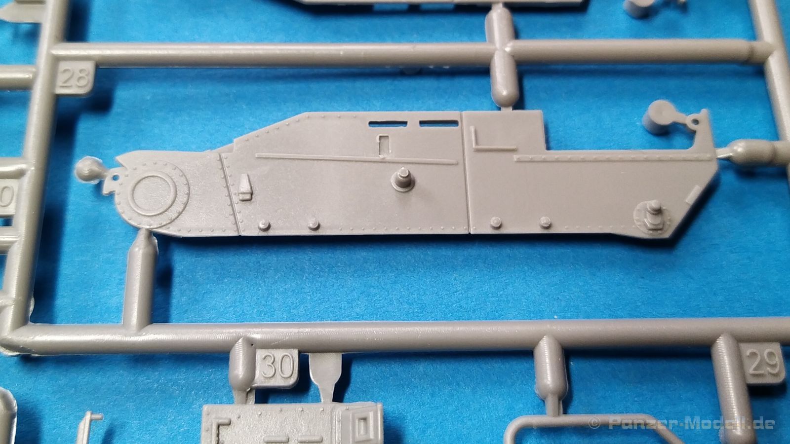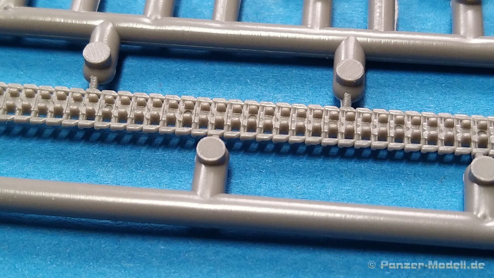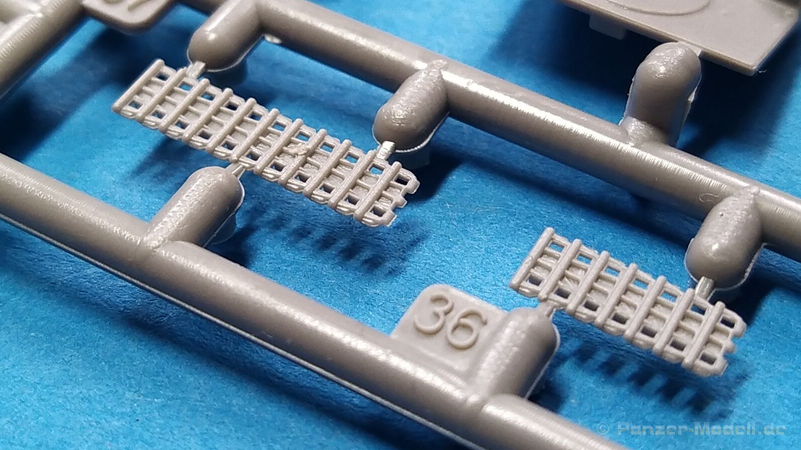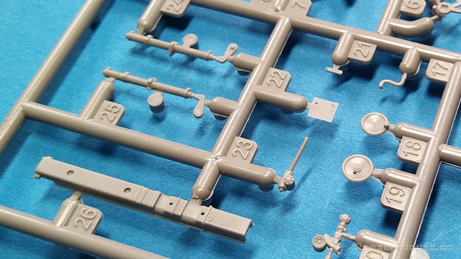 Der erste Eindruck nach Öffnen des Kartons ist gut. Die Teile wurden sauber gespritzt und weisen eine gute Detailierung auf. Es gibt zwar zahlreiche Auswerfermarken, diese aber weites gehend nur an später nicht mehr sichtbaren Stellen. Bei näherer Betrachtung finden sich lediglich im Bereich der Ketten einige Marken, die evtl. später sichtbar werden, falls Sie nicht von den Laufrollen und Fahrwerksteilen abgedeckt werden. Also kein großes Problem. Neben einigen Sinkstellen (nur im Bereich der Rahmen) finden sich auch einige Fischhäute die etwas den guten Gesamteindruck trüben. Diese lassen sich aber leicht entfernen. Die Angüsse sind teilweise etwas groß ausgefallen, dies ist aber dem kleinen Maßstab geschuldet. Die Bausatzdetaillierung ist aber ansonsten gut und weist als Highlights die offene Darstellung von Kanone und Auspuff dank Slide-Mold-Technik auf. Die Wanne und der Kampfraum sind aus einzelnen Teilen winklig zusammenzusetzen, dies geht aber dank dem Aufbau der Teile problemlos. Die Detailierung des Kampfraumes ist spritzgussbedingt etwas einfacher ausgeführt, weiß aber zu gefallen. Es wurde alles Notwendige dargestellt und bietet eine gute Grundlage für eine weitere Detailierung. Die markanten Bauteile wie die 38 t typischen Nieten und die Trittbleche wurden gut dargestellt ohne übertrieben stark zu wirken. Die Fahrerluke kann leider nur geschlossen dargestellt werden. Im Bereich der Wanne bzw. dem Laufwerk fallen die stark vereinfachten Federblöcke negativ auf. Diese sind leider ohne Struktur wiedergegeben, werden aber weites gehend durch die Laufrollen verdeckt. Wie bei anderen Revell-Modellen gelöst, sollen auch bei diesem Bausatz die einteiligen Ketten nach dem Versäubern gebogen werden und anschließend ans Laufwerk angepasst werden. Hier wären sicherlich Segmentketten die schönere Lösung gewesen. Bei der Detailierung von Gittern und Lochblechen ist den Spritzgussteilen sicherlich eine Grenze gesetzt. Deshalb sollte man die Kiste auf dem linken Fender, die Auspuffabdeckung und das Gitter an der rechten Seite für eine bessere Detailierung gegen Ätzteile austauschen, oder die Teile aufbohren bzw. dünner schleifen. Auch die Darstellung der Antennen, Spriegel und diverser Griffe ist in den beiliegenden Spritzgussteilen des Bausatzes maßstäblich zu dick. Hier erreicht man aber durch die Verwendung von Draht schnell Verbesserungen in der Detailierung. Positiv fallen die losen Werkzeuge, das mehrteilige Funkgerät und die einzelnen Granaten auf, die der Detailierung des Modells zuträglich sind. Die Kampfbeladung (Munition) ist komplett aufgefüllt dargestellt. Das Geschütz bleibt in eingebautem Zustand beweglich. Die Heckklappe kann entgegen der Angabe in der Bauanleitung für einen Feuerkampf auch offen angeklebt werden. Die Bauanleitung ist zweisprachig ausgelegt. Es gibt Hinweise in englischer und deutscher Sprache. Zu Beginn findet man eine Übersicht der enthaltenen Spritzlinge, Decals, etc. Gefolgt von kurzen Erläuterungsgrafiken und Handlungsanweisungen. Anschließend folgt eine Übersicht mit Farbangaben zu revell-eigenen Farben. Im Weiteren folgt die eigentliche Bauanleitung, die sich in 34 Baustufen gliedert. Hier wird pro Baustufe anhand von mehrfarbigen 3D-Zeichnungen Schritt für Schritt der Weg zum fertigen Modell dargestellt bzw. erklärt. Die letzten beiden „Baustufen“ (33 u. 34.) sind dann auch schon die zwei verschiedenen Farb- und Markierungsvarianten. Folgende Versionen sind hier dargestellt: