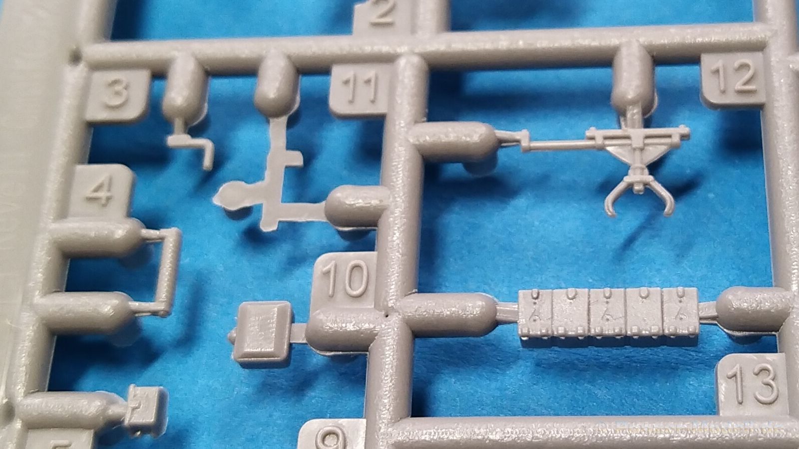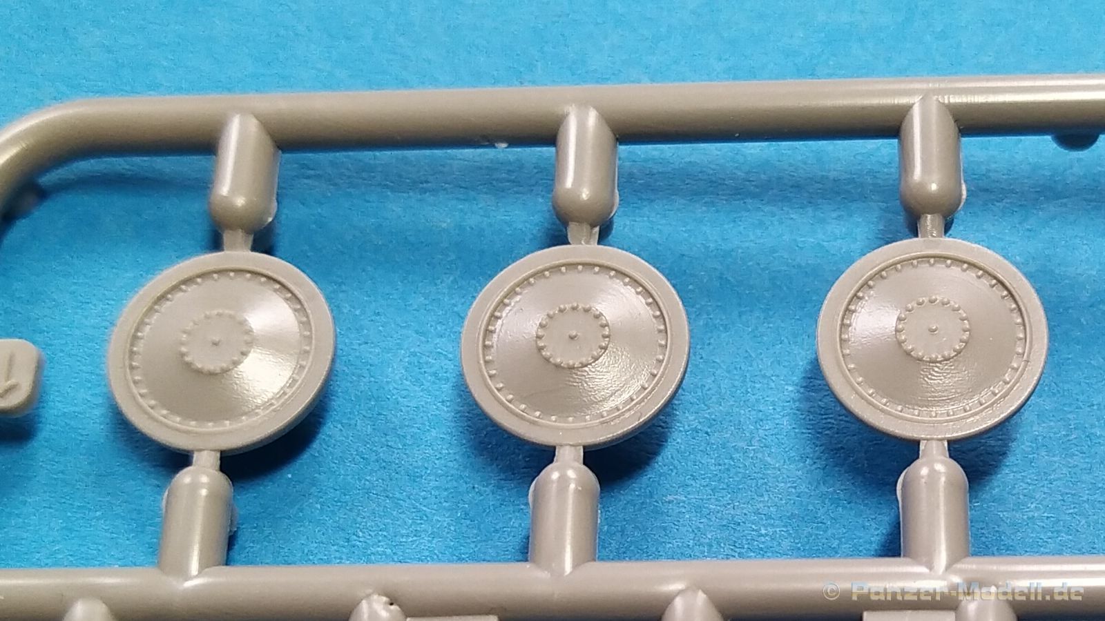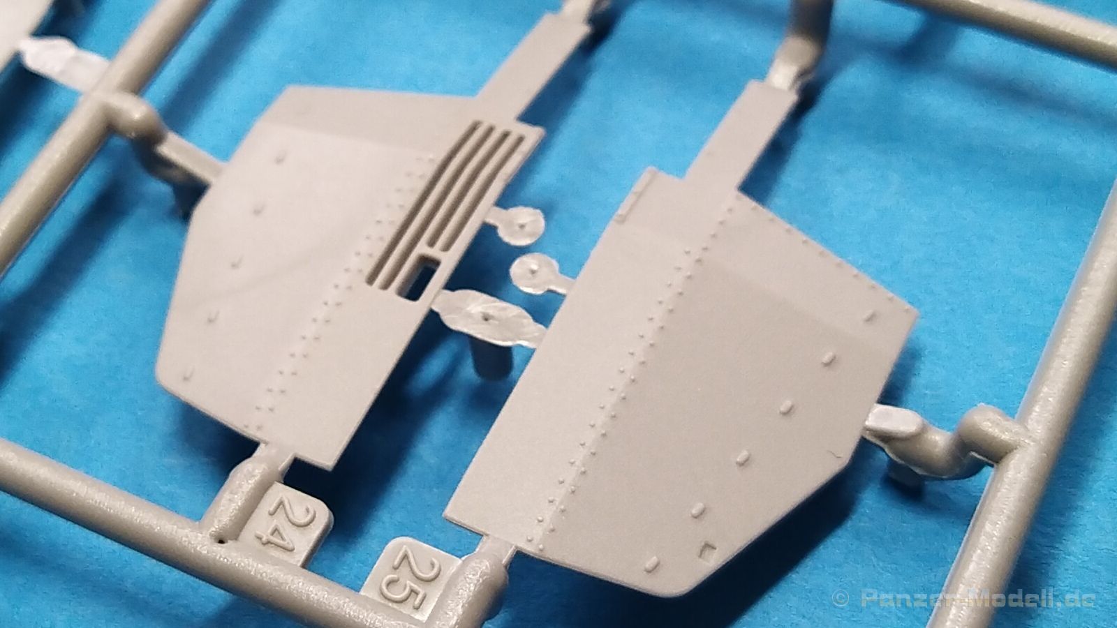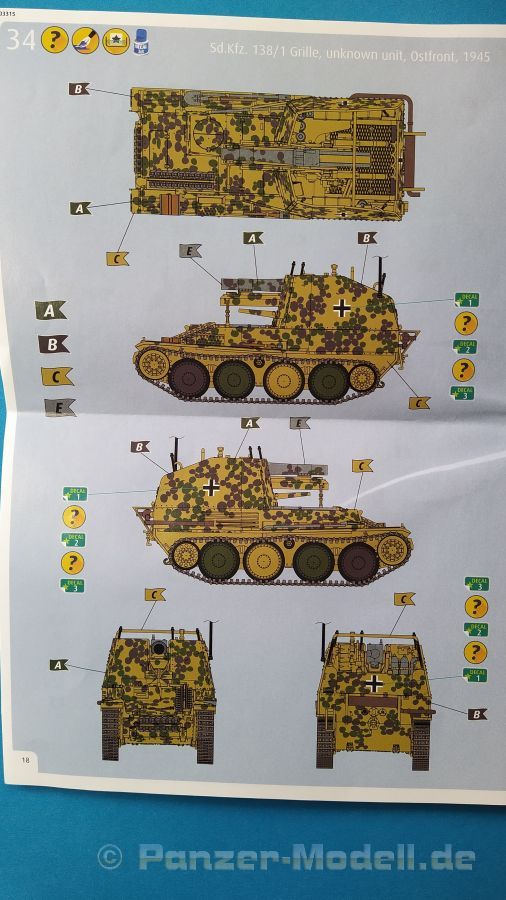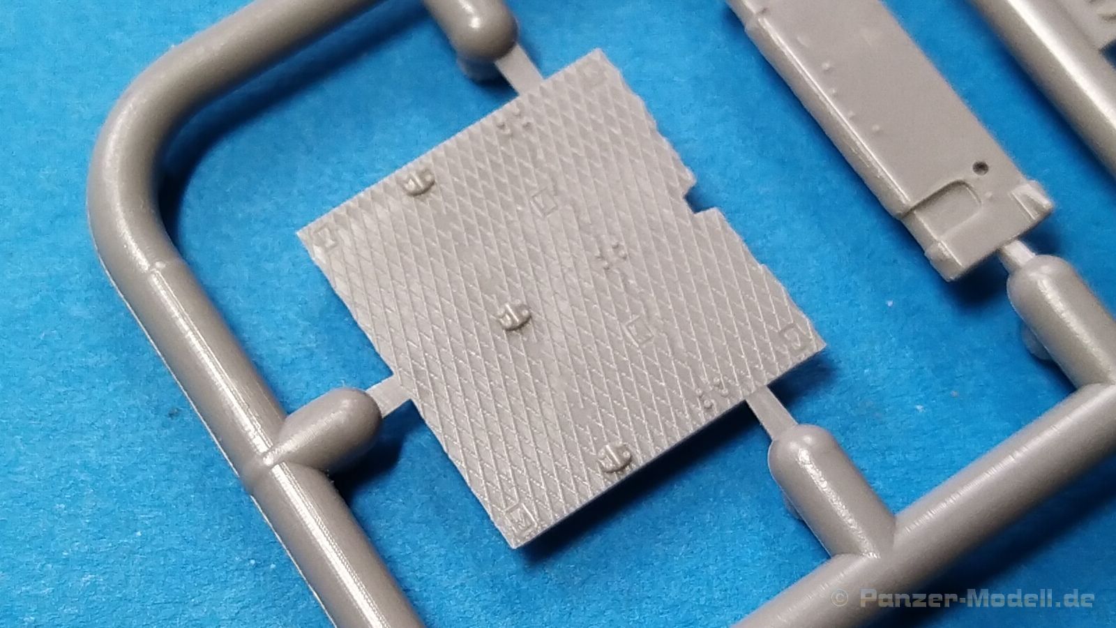 Der erste Eindruck nach Öffnen des Kartons ist gut. Die Teile wurden sauber gespritzt und weisen eine gute Detailierung auf. Es gibt zwar zahlreiche Auswerfermarken, diese aber weites gehend nur an später nicht mehr sichtbaren Stellen. Bei näherer Betrachtung finden sich lediglich im Bereich der Ketten einige Marken, die evtl. später sichtbar werden, falls Sie nicht von den Laufrollen und Fahrwerksteilen abgedeckt werden. Also kein großes Problem. Neben einigen Sinkstellen (nur im Bereich der Rahmen) finden sich auch einige Fischhäute die etwas den guten Gesamteindruck trüben. Diese lassen sich aber leicht entfernen. Die Angüsse sind teilweise etwas groß ausgefallen, dies ist aber dem kleinen Maßstab geschuldet. Die Bausatzdetaillierung ist aber ansonsten gut und weist als Highlights die offene Darstellung von Kanone und Auspuff dank Slide-Mold-Technik auf. Die Wanne und der Kampfraum sind aus einzelnen Teilen winklig zusammenzusetzen, dies geht aber dank dem Aufbau der Teile problemlos. Die Detailierung des Kampfraumes ist spritzgussbedingt etwas einfacher ausgeführt, weiß aber zu gefallen. Es wurde alles Notwendige dargestellt und bietet eine gute Grundlage für eine weitere Detailierung. Die markanten Bauteile wie die 38 t typischen Nieten und die Trittbleche wurden gut dargestellt ohne übertrieben stark zu wirken. Die Fahrerluke kann leider nur geschlossen dargestellt werden. Im Bereich der Wanne bzw. dem Laufwerk fallen die stark vereinfachten Federblöcke negativ auf. Diese sind leider ohne Struktur wiedergegeben, werden aber weites gehend durch die Laufrollen verdeckt. Wie bei anderen Revell-Modellen gelöst, sollen auch bei diesem Bausatz die einteiligen Ketten nach dem Versäubern gebogen werden und anschließend ans Laufwerk angepasst werden. Hier wären sicherlich Segmentketten die schönere Lösung gewesen. Bei der Detailierung von Gittern und Lochblechen ist den Spritzgussteilen sicherlich eine Grenze gesetzt. Deshalb sollte man die Kiste auf dem linken Fender, die Auspuffabdeckung und das Gitter an der rechten Seite für eine bessere Detailierung gegen Ätzteile austauschen, oder die Teile aufbohren bzw. dünner schleifen. Auch die Darstellung der Antennen, Spriegel und diverser Griffe ist in den beiliegenden Spritzgussteilen des Bausatzes maßstäblich zu dick. Hier erreicht man aber durch die Verwendung von Draht schnell Verbesserungen in der Detailierung. Positiv fallen die losen Werkzeuge, das mehrteilige Funkgerät und die einzelnen Granaten auf, die der Detailierung des Modells zuträglich sind. Die Kampfbeladung (Munition) ist komplett aufgefüllt dargestellt. Das Geschütz bleibt in eingebautem Zustand beweglich. Die Heckklappe kann entgegen der Angabe in der Bauanleitung für einen Feuerkampf auch offen angeklebt werden. Die Bauanleitung ist zweisprachig ausgelegt. Es gibt Hinweise in englischer und deutscher Sprache. Zu Beginn findet man eine Übersicht der enthaltenen Spritzlinge, Decals, etc. Gefolgt von kurzen Erläuterungsgrafiken und Handlungsanweisungen. Anschließend folgt eine Übersicht mit Farbangaben zu revell-eigenen Farben. Im Weiteren folgt die eigentliche Bauanleitung, die sich in 34 Baustufen gliedert. Hier wird pro Baustufe anhand von mehrfarbigen 3D-Zeichnungen Schritt für Schritt der Weg zum fertigen Modell dargestellt bzw. erklärt. Die letzten beiden „Baustufen“ (33 u. 34.) sind dann auch schon die zwei verschiedenen Farb- und Markierungsvarianten. Folgende Versionen sind hier dargestellt: