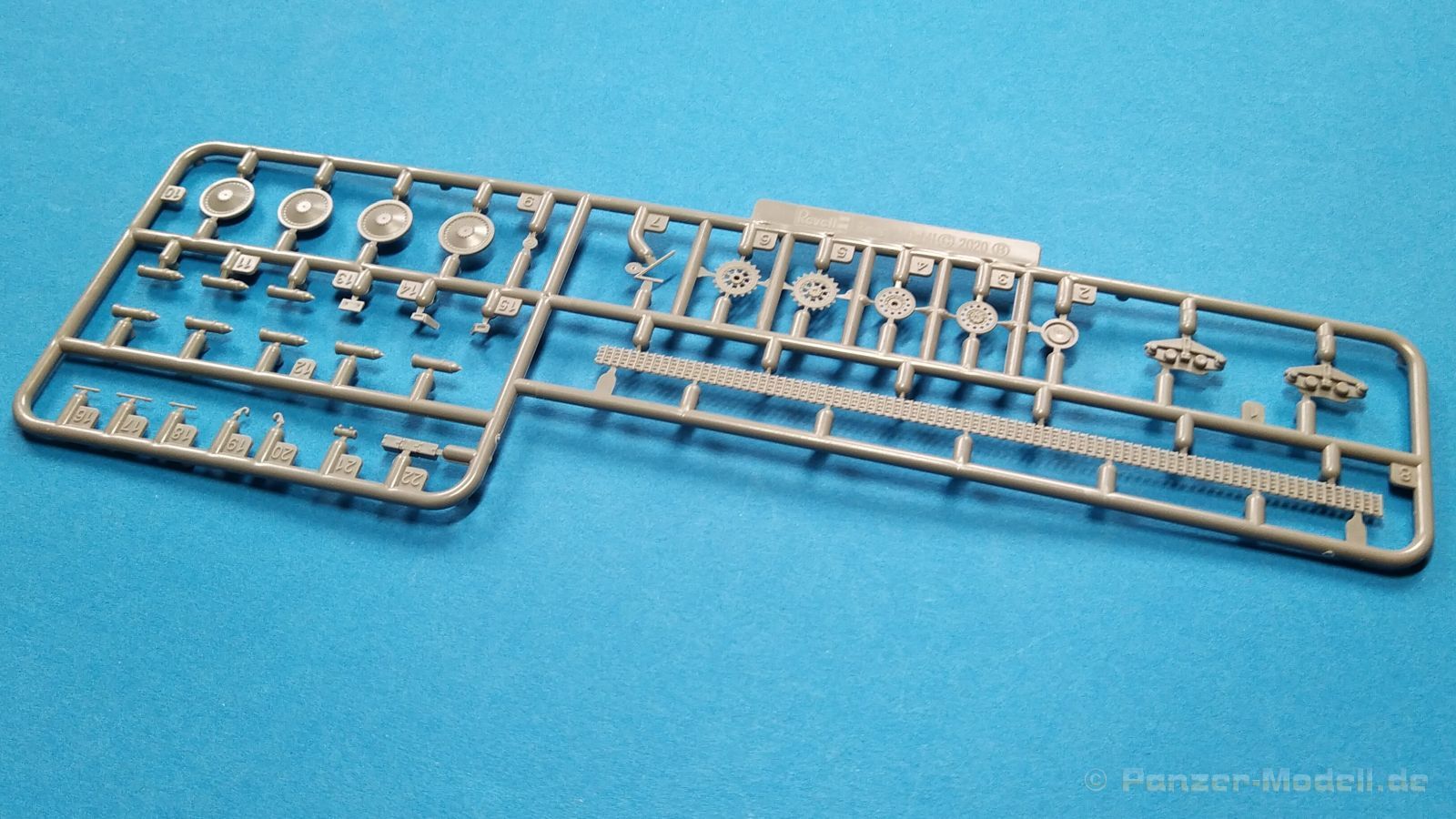 Ein kurzer Abriss zum Original: Die offizielle Bezeichnung für dieses von der Wehrmacht im Zweiten Weltkrieg eingesetzte Fahrzeug lautete „15-cm-schweres Infanteriegeschütz 33 (Sf.) auf Geschützwagen 38 Ausf. M“ (Sd.Kfz. 138/1). Es trug den Beinamen “Grille“. Das im Modell dargestellte Fahrzeug basierte auf einem für Selbstfahrlafetten modifizierten Fahrgestell des Panzerkampfwagen 38(t) aus tschechischer Fertigung. Ursprünglich für den Panzerjäger Marder III entworfen, befand sich der Motor bei dieser Konstruktion nun in der Mitte der Wanne, was auch die Bezeichnung Ausf. M erklärt. Diese Wanne wurde deshalb mit geringen Modifikationen als Basis für die „Grille“ und den Flakpanzer 38(t) übernommen. Der Vorteil bei der Anordnung des Motors in der Mitte war, das dadurch im hinteren Teil die 150-mm-Haubitze befestigt werden konnte, was der Balance des Fahrzeugs zugutekam. Die Konstruktion war eine gute Möglichkeit das schwere Infanteriegeschütz 33 mobil zu machen. Im Einsatz zeigten sich die relativ dünne Panzerung und der geringe Munitionsvorrat als Schwachstellen. Das Problem mit dem Munitionsvorrat konnte durch die Schaffung des Munitionsträgers Grille abgestellt werden. Fahrzeuge dieses Typs sind von 1943 bis 1945 in Prag produziert worden. Eingesetzt wurden die Grillen in den Artillerieabteilungen diverser Panzer- und Panzergrenadierdivisionen. Nun aber zu Modell: Der Bausatz wurde ursprünglich von der Firma Toxso Model aus China konstruiert, aber nie veröffentlicht. Revell kaufte die Spritzgussformen dieser Firma auf und bringt nun nach und nach verschiedene Modelle davon unter eigenem Label heraus. Neben dem Marder III aus gleicher Quelle ist dieses der nächste Bausatz. Schauen wir mal was uns in der revell-typischen Faltschachtel (ca. 24 x 16 x 4cm) erwartet. Im Karton findet man den folgenden Inhalt: