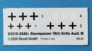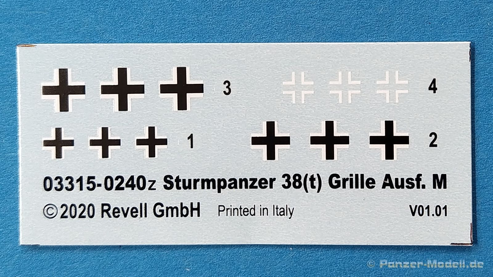 Die Decals beschränken sich leider nur auf verschieden große Balkenkreuze und keinen weiteren Kennzeichnungen oder Einheitsabzeichen. Sie sind auf blauem Trägerpapier gedruckt und von guter Qualität. Leider sind bei meinem mir vorliegenden Exemplar einige Balkenkreuze verdruckt. Mein Fazit: Revell bringt mit diesem Modellbausatz einen von der Detaillierung her guten Bausatz dieses Fahrzeuges im Maßstab 1:72 auf den Markt, den es bislang nur in Short-Run Qualität von anderen Herstellern gab. Mit den dargebotenen Teilen lässt sich hier mit wenig Aufwand ein ansehnliches Modell bauen. Ein wenig bemängeln muss man die dargestellten Bemalungsvarianten ohne Einheitszugehörigkeitsangaben. Hier wäre aus diverser Literatur sicherlich noch einiges an Vorbildinformation rauszuholen gewesen. Aber vielleicht nimmt sich ja der Aftermarket diesem Problem an, oder Revell bietet mehr Optionen in einer zweiten Auflage? Wegen dem einfachen Aufbau des Bausatzes und der Anzahl der Teile ist dieser Bausatz auch schon für den Anfänger im Bereich Panzermodelle geeignet. Bietet aber durch die zusätzliche Verwendung von Ätzteilen aus dem Zubehörhandel eine gute Basis für den fortgeschrittenen Modellbauer. Ätzteile und weitere Zubehörteile gibt es bislang nicht speziell für dieses Fahrzeug / diesen Bausatz. Teile anderer Hersteller für andere PzKpfw. 38(t)-Varianten können aber sicherlich angepasst werden. Für den Preis von ca. 15 Euro von mir eine absolute Kaufempfehlung.