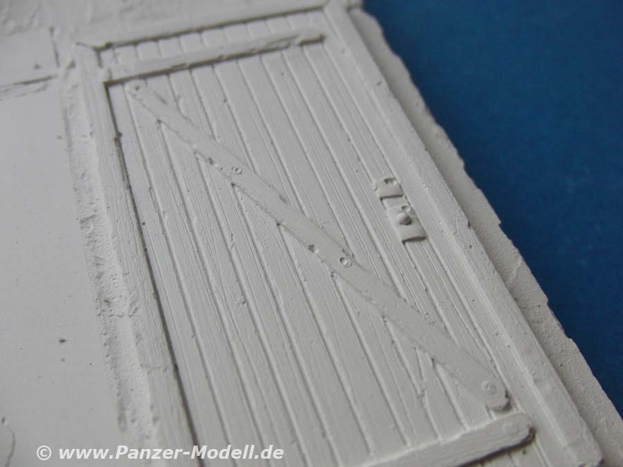 Die Wände des Hauses sind sehr schön mit rauem und stellenweise abgefallenem Putz versehen. Die mit eingegossene Eingangstür an der Treppe ist sehr schön und detailliert gegossen mit Holzstruktur und Beschlägen. Auch die Verzierungen am Torbogen sind sehr gut und fein umgesetzt.