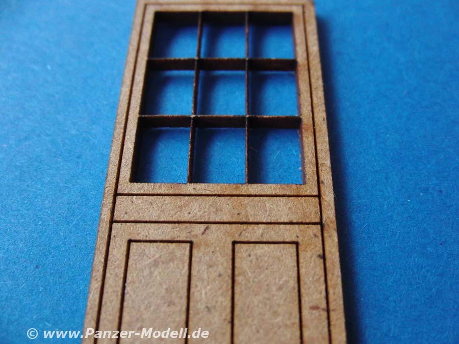 Die Aussparungen für Fenster und Türen sind sauber und die Tür und Fensterrahmen aus fein sauber gelasertem Holz.
