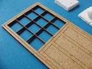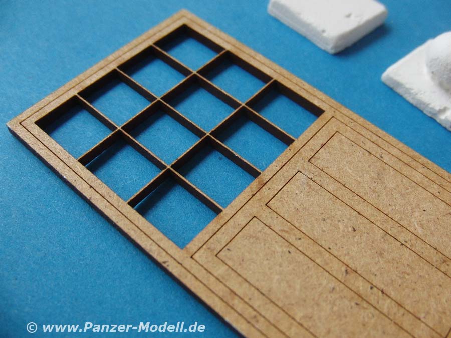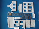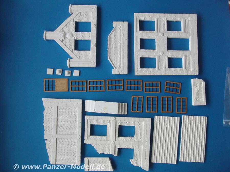 Im stabilen Karton finden sich ganze 14 Gips Teile, eine holzgelaserte Tür, sowie 10 Fenster.