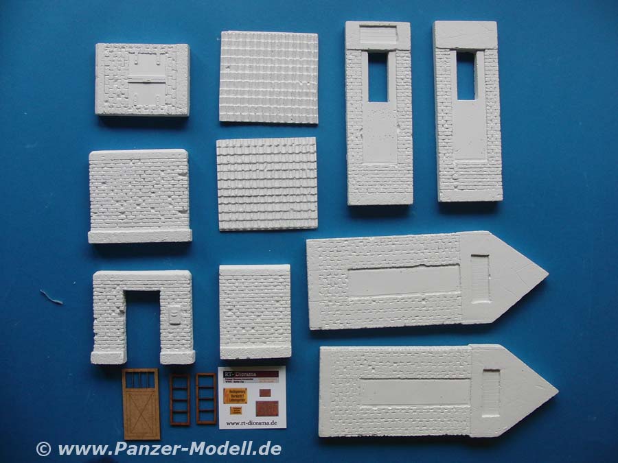 Im stabilen Karton, schön in Luftpolsterfolie gewickelt finden sich 10 Gips Teile, ein Decalbogen, sowie eine holzgelaserte Tür und zwei Fenster.