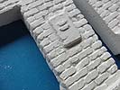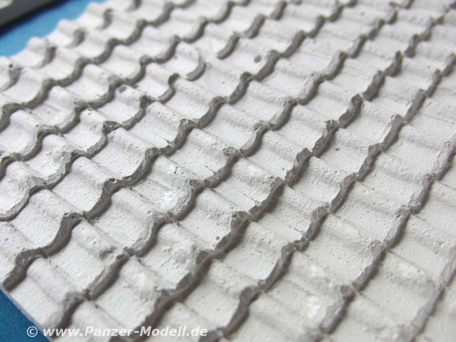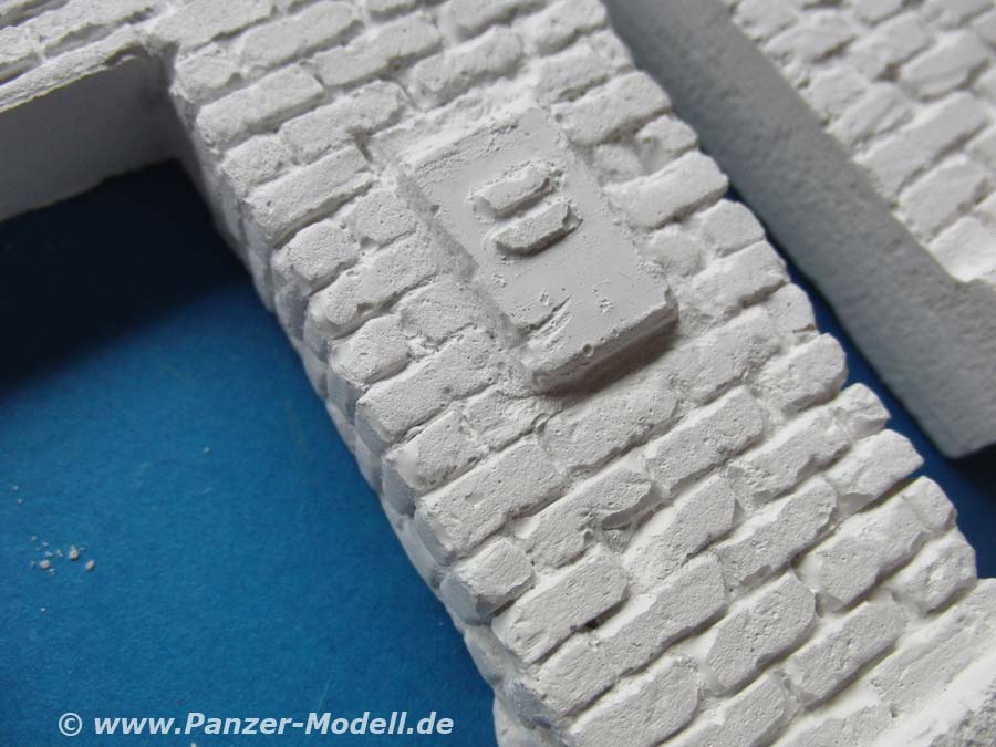 Die Gips Teile sind 1A fein und sauber gegossen und weisen hervorragende Details auf. In der Hauptsache sind dies die gemauerten Ziegel, aber auch die Einlässe und Absätze sind sehr schön und mit Struktur herausgearbeitet. Ober abgeschlossen wird diese von zwei dünnen Platten mit Dachpfannen.