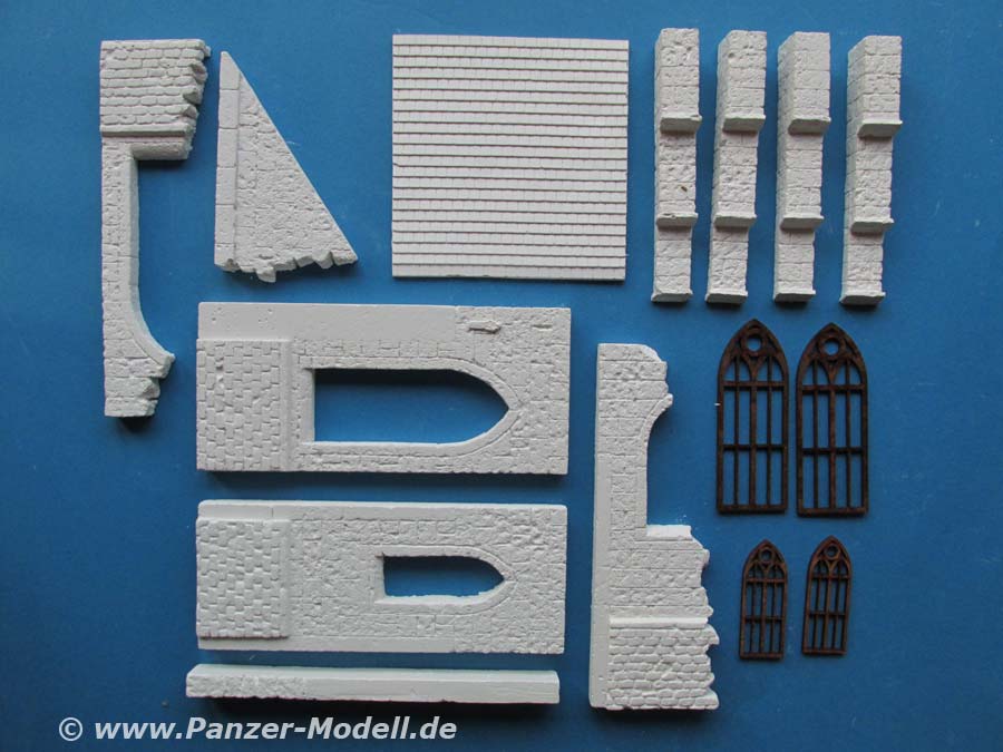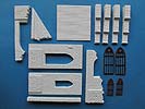 Das vorliegende Set beinhaltet 11 Gipsteile sowie 2 große und 2 kleinere Kirchenfenster aus lasergeschnittenem Holz.