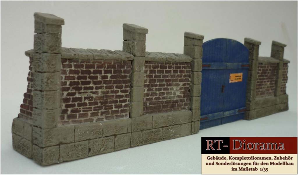 Dieses Set stellt ein Stück einer Grundstücksmauer mit großem Tor dar und ist modular aufgebaut. Drei der Mauerteile sind identisch und können beliebig kombiniert und auch entsprechend verlängert werden. Zum beiderseitigen Abschluss stehen zwei Mauerreststücke zur Verfügung.