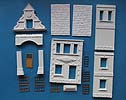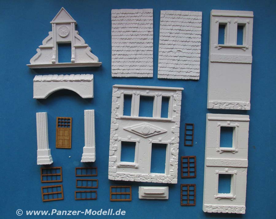 Das vorliegende Set beinhaltet 10 Gipsteile sowie 9 Fenster und eine Tür aus lasergeschnittenem Holz.