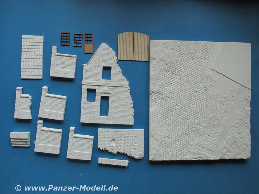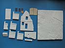 Das vorliegende Set beinhaltet 11 Gipsteile sowie 2 Fenster, eine Tür und 2 Torflügel aus lasergeschnittenem Holz.