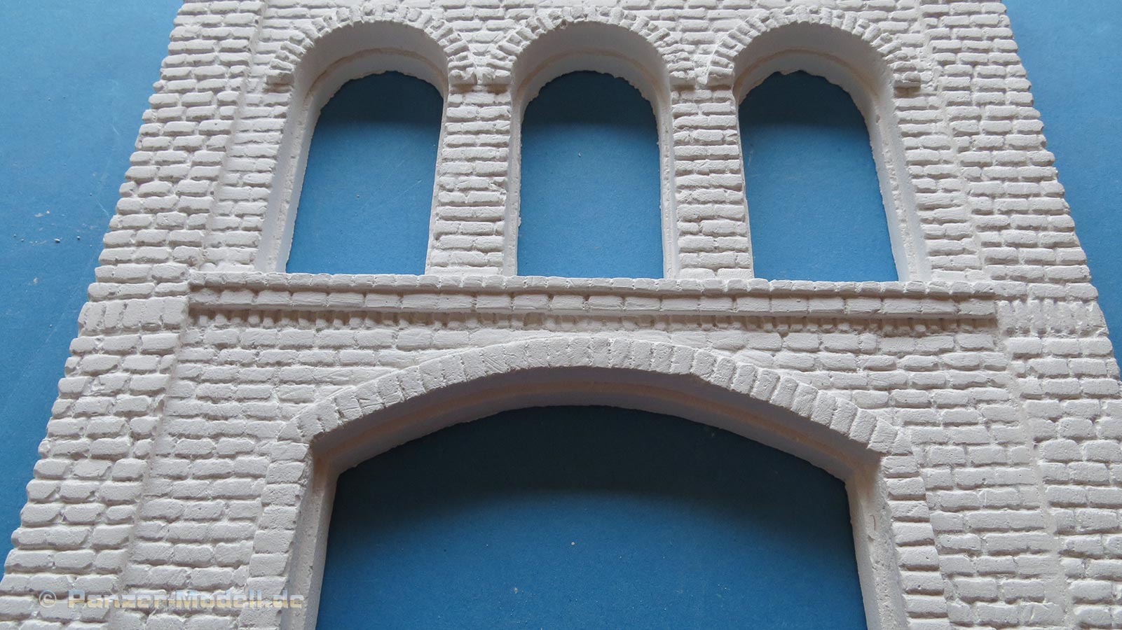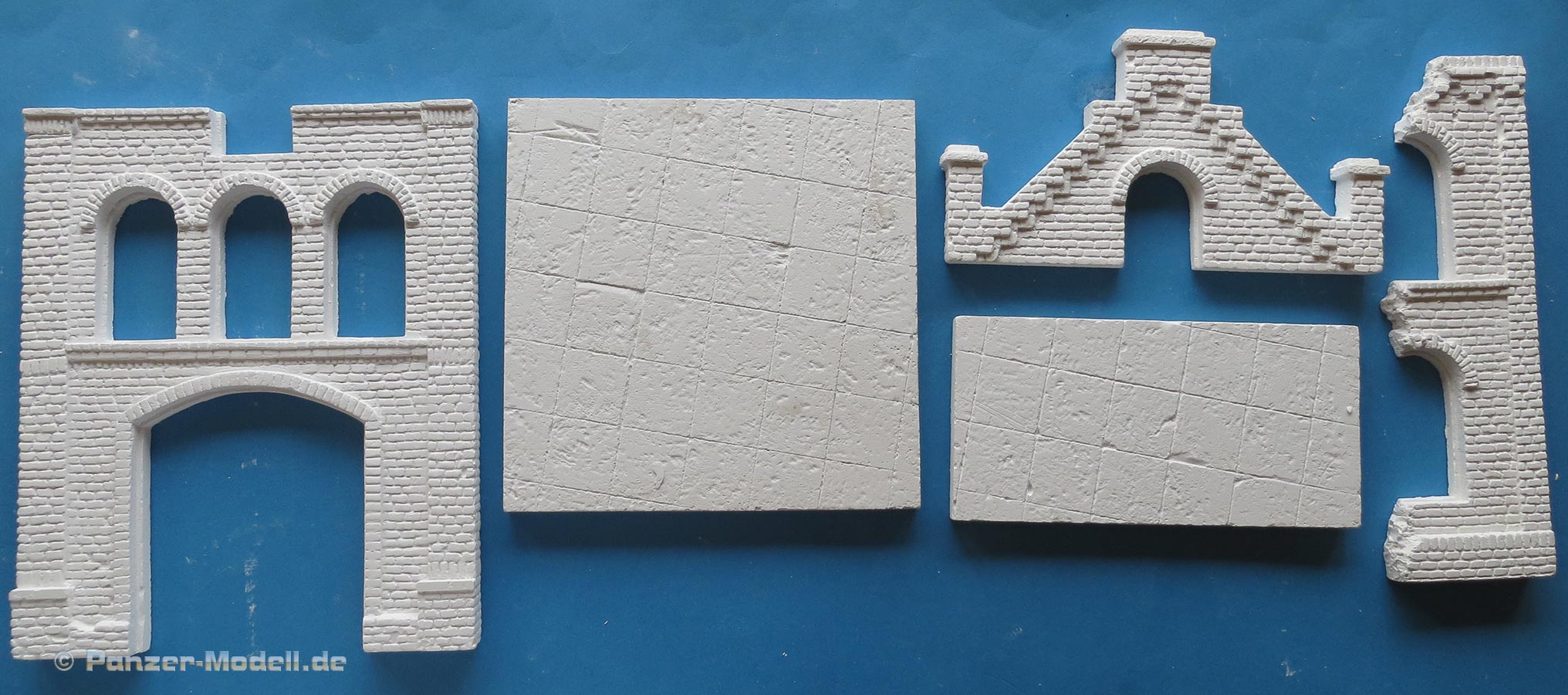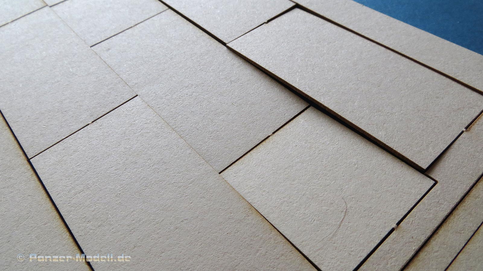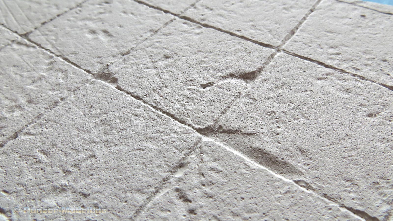 Diese Teile bauen sich zu einer Dioramengrundplatte mit den Maßen 37 x 27,5cm mit aus Betonplatten gelegtem Bereich des gesamten Geländes.