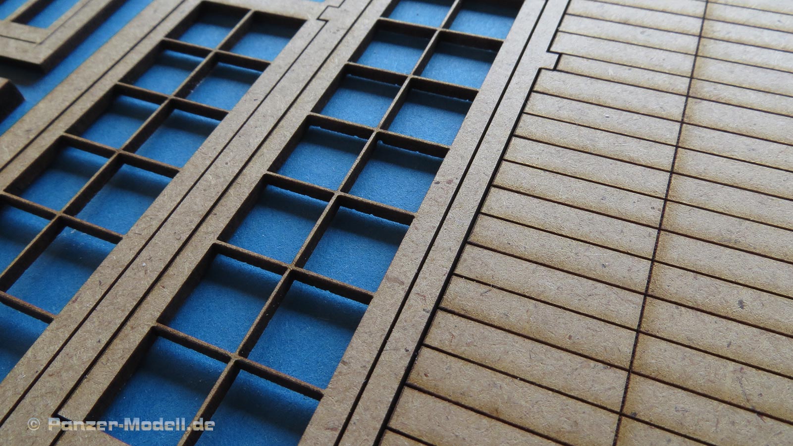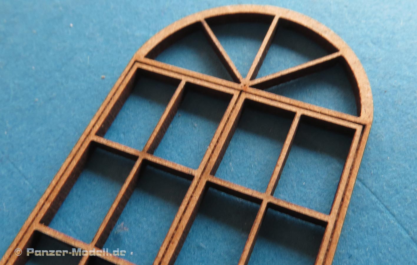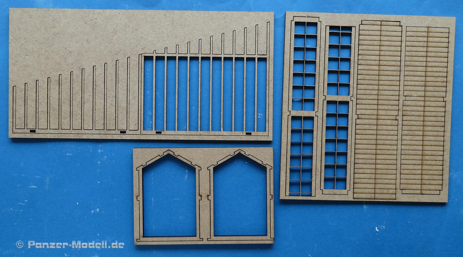 Die Öffnungen für Tor und die Fenster sind bereits ausgelassen und werden mit gelaserten Holzfensterrahmen und ebenfalls gelasterten Holztoren vervollständigt. Fenster"glas" liegt dem Bausatz leider nicht bei - da muss der Modellbauer selber improvisieren oder auf die Fenster-Sets aus dem RT Diorama Programm zurückgreifen, die hier passend und unheimlich realistisch gestaltet sind.