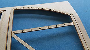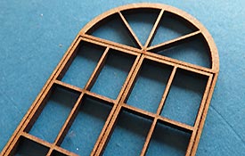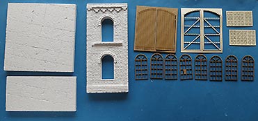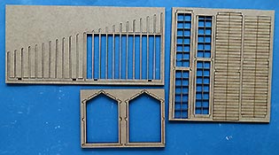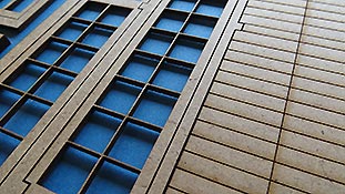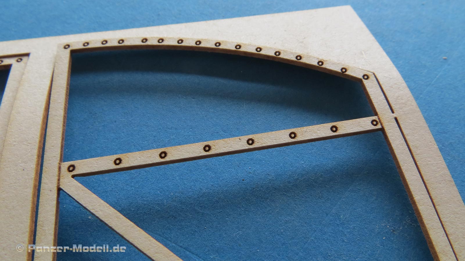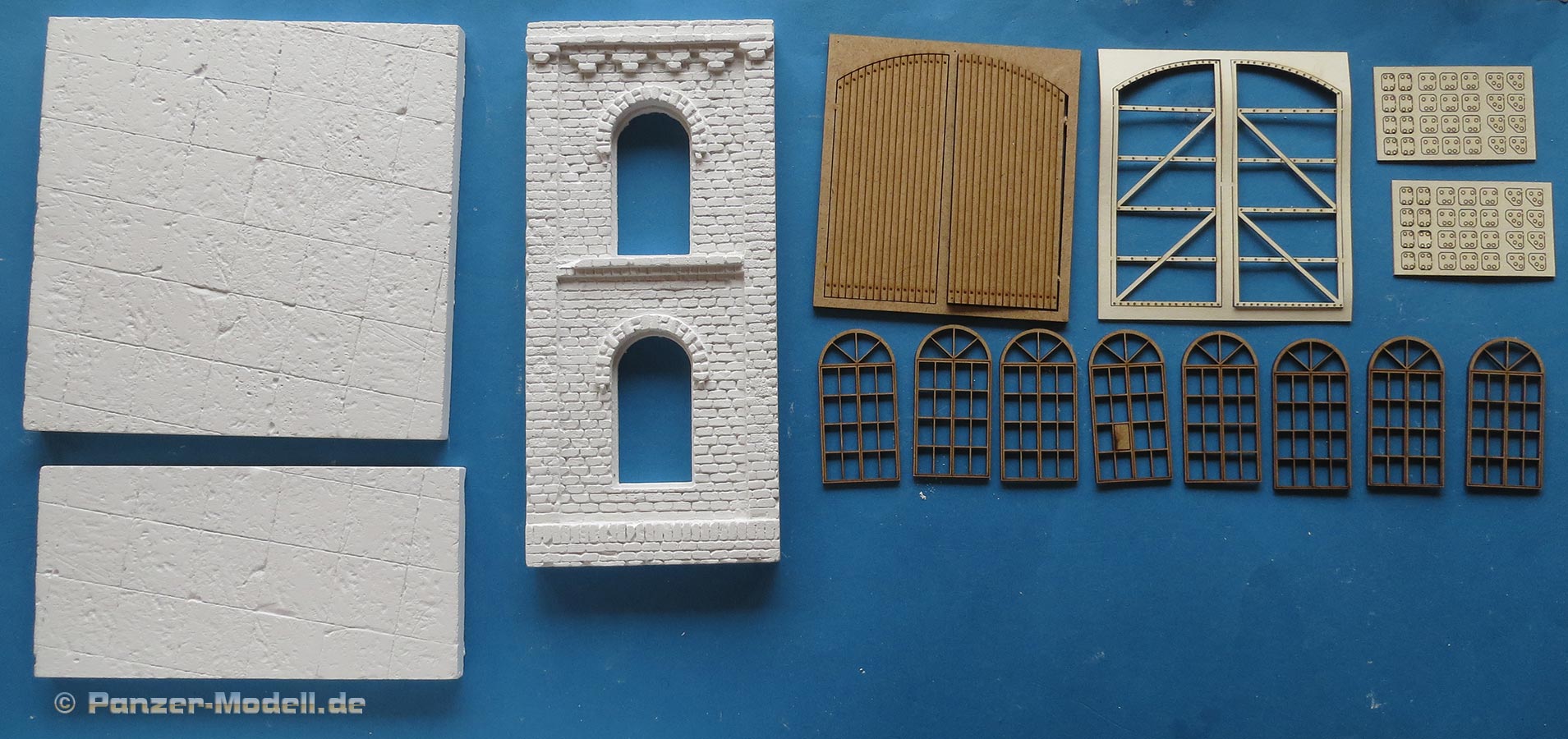 Die Öffnungen für Tor und die Fenster sind bereits ausgelassen und werden mit gelaserten Holzfensterrahmen und ebenfalls gelasterten Holztoren vervollständigt. Fenster"glas" liegt dem Bausatz leider nicht bei - da muss der Modellbauer selber improvisieren oder auf die Fenster-Sets aus dem RT Diorama Programm zurückgreifen, die hier passend und unheimlich realistisch gestaltet sind.